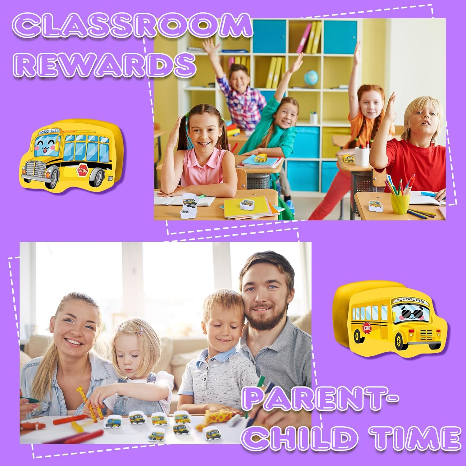 - School Bus Design: the school bus design of these mini erasers enhances the fun of erasing; The cute expression on each eraser makes them eye-catching and versatile; They can be applied not only for erasing mistakes but also as party favors, teaching tools, and homework rewards