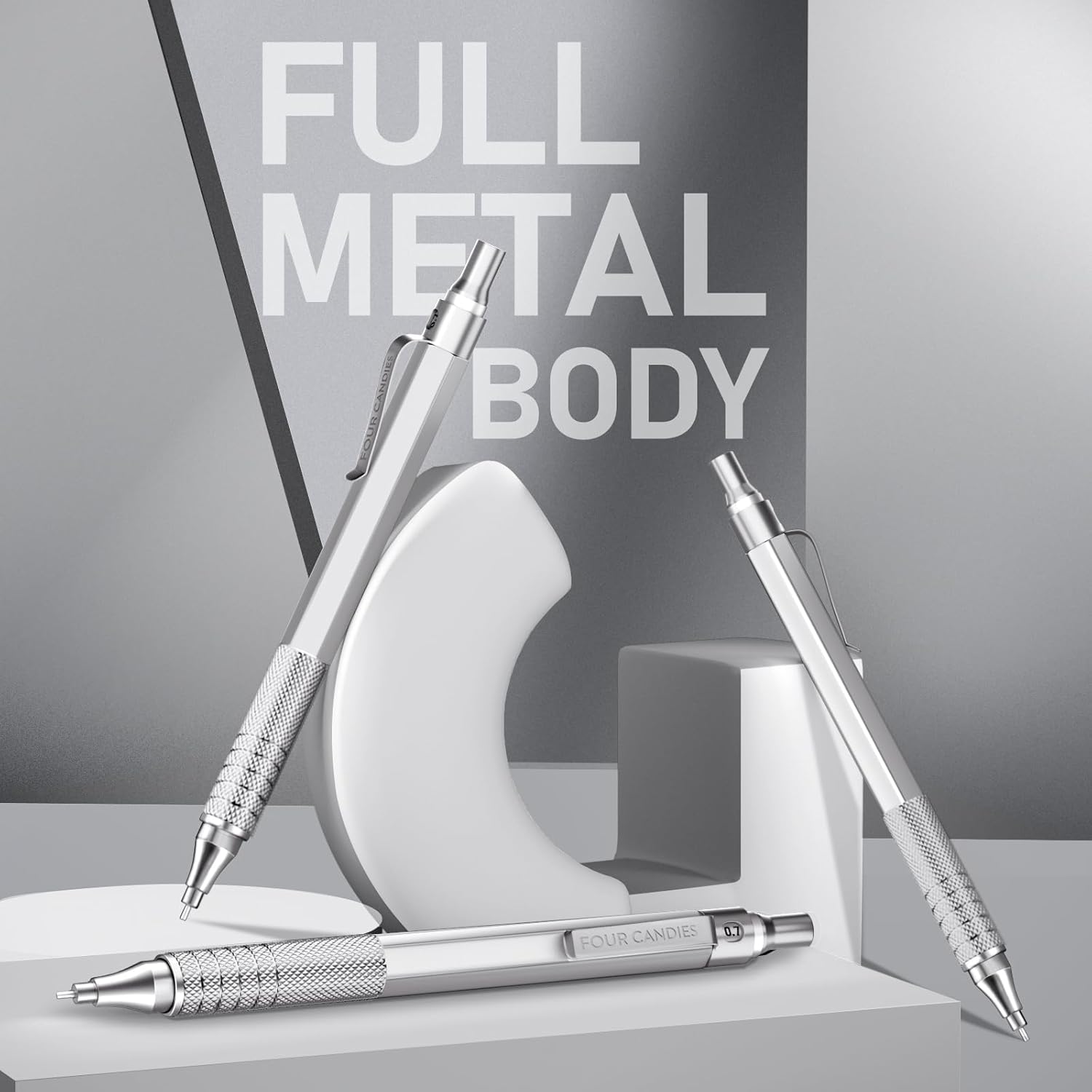 Four Candies 0.7mm Mechanical Pencil Set with Case, 3PCS Metal Artist Lead Pencil with 8 Tubes (480PCS) HB Lead Refills, 3 Erasers, 9 Eraser Refills For Engineer Art Writing Drawing Drafting, Silver