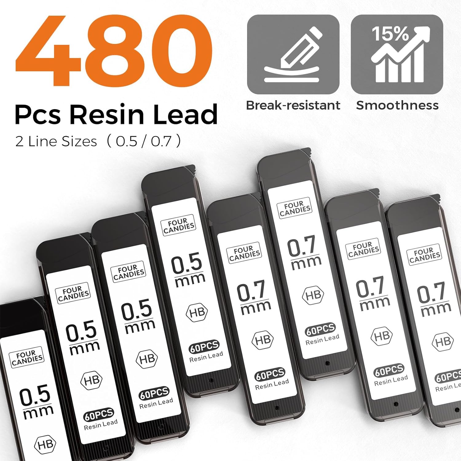 • 【480PCS Resin Lead】8 tubes of 60pcs super capacity leads. A more durable resin lead which doesn’t require sharpening and is not easy to break at the tip or break in the shaft, provides ultra-smooth writing and clear dark lines.