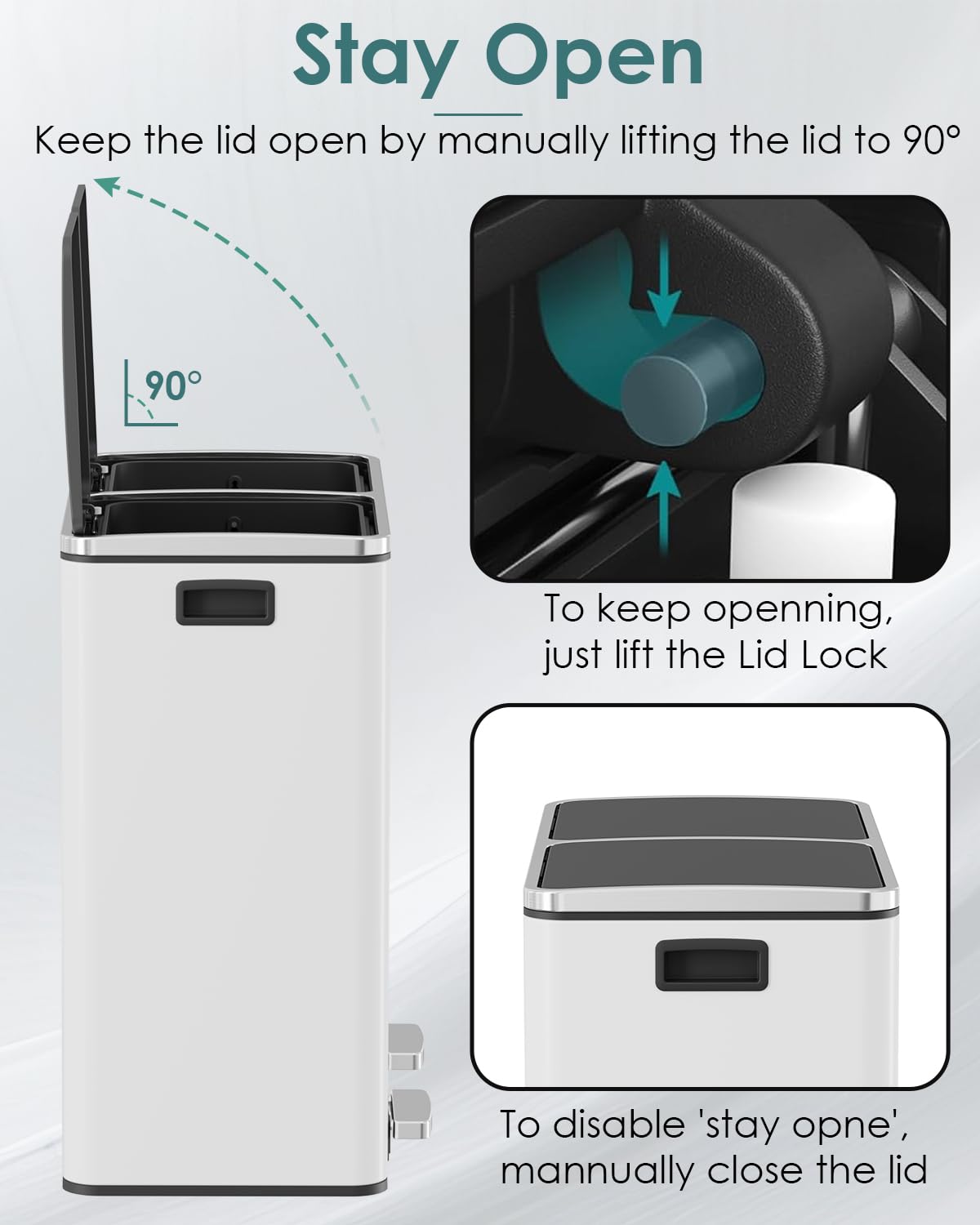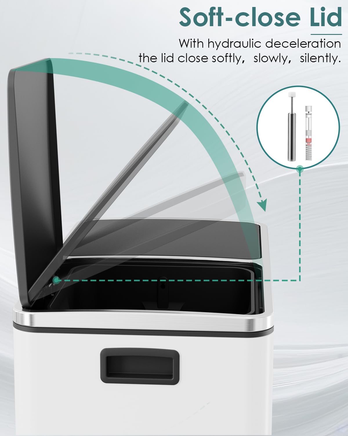 - GENTLE&SEALED LIDS: 60L trash lid is designed with ABS hydraulic deceleration to close gently and silently, minimizing noise and preventing it from slamming shut. Sealed lids fit tightly to block unpleasant odors, keeps your home smelling fresh and clean.