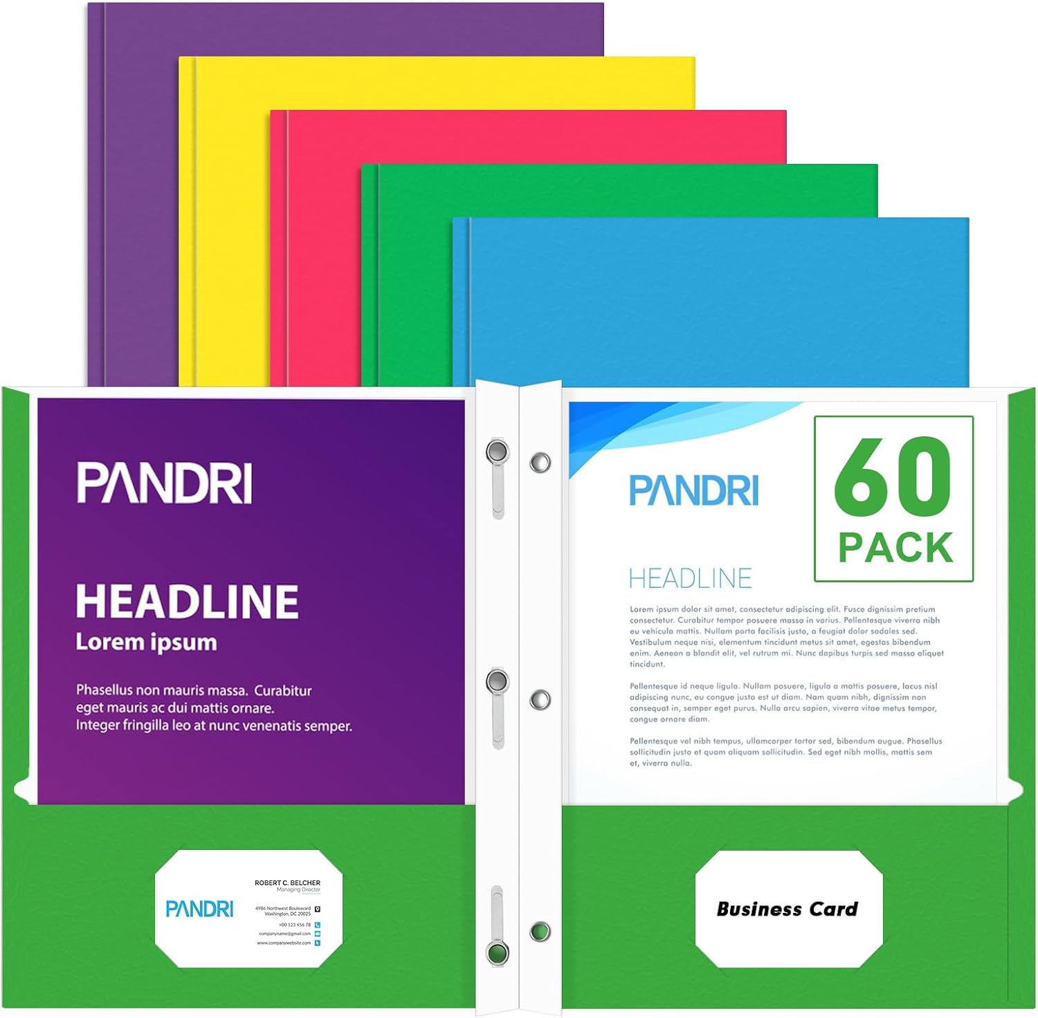 Two Pocket Folders, PANDRI 60 Pack Two Pocket Folders with Prongs, 2 Pocket 3 Prong Folders Designed for Office and Classroom, Letter Size, Assorted 5 Colors