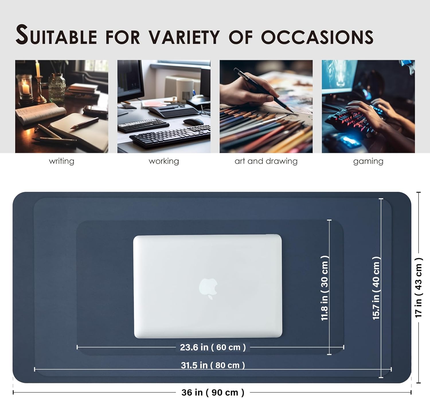 • Versatile Sizes & Comfortable Touch: Choose from Multiple sizes - all with a 1.5mm thickness for comfort. Perfect for different settings, the compact sizes (23.6"x13.8") for small desks, standard options (27.6"x13.8", 31.5"x15.7", 36"x17") for daily office use, and expanded layouts (47.2"x17") for spacious multi-device setups.