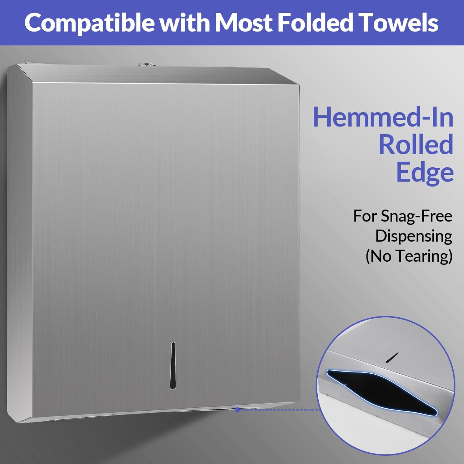 Paper Towel Dispenser Wall Mount, Brushed Stainless Steel Commercial Paper Towel Holder with Lock, Large Capacity 400 C Fold/525 Multifold Towels