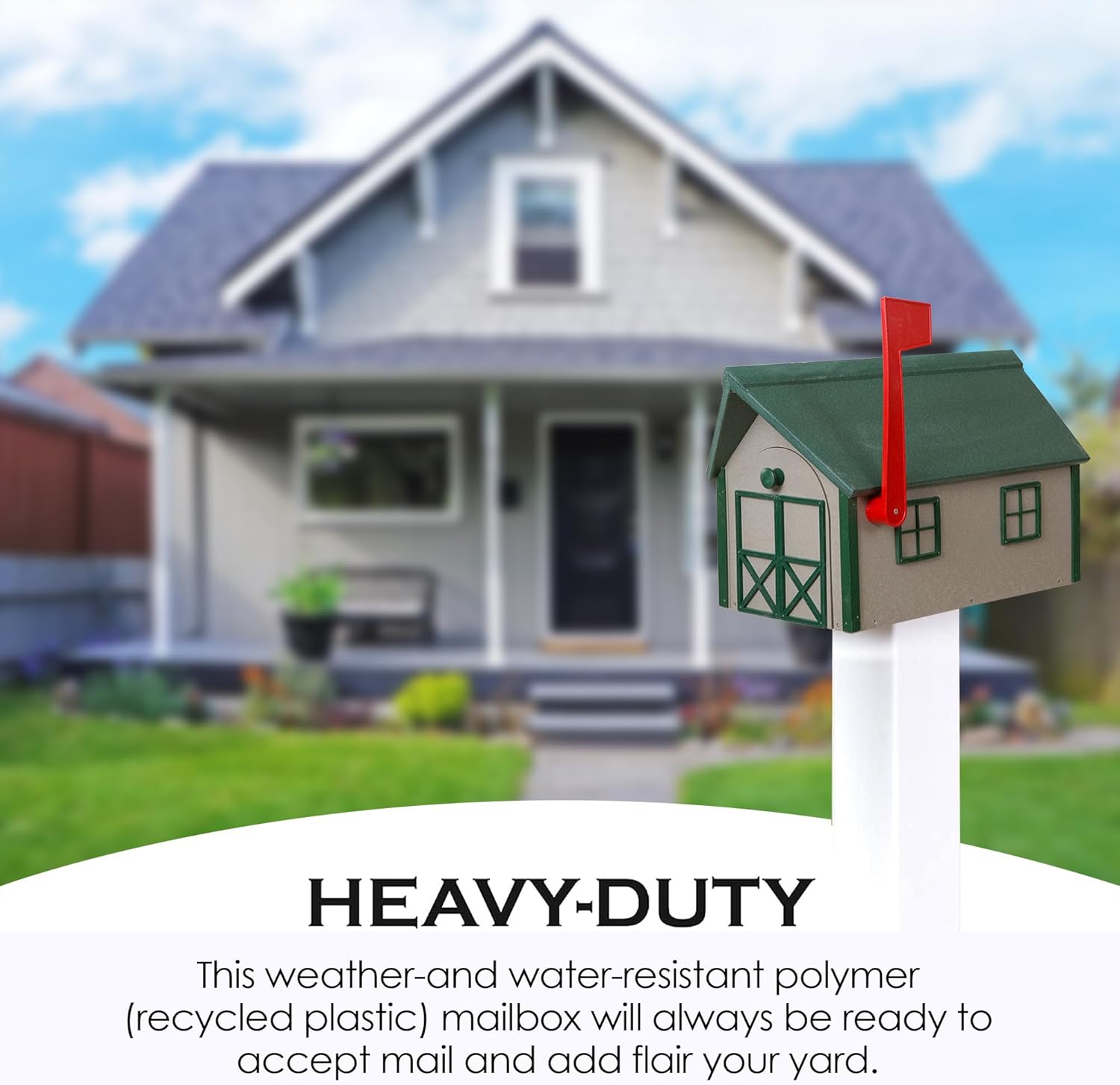 - MADE OF WATER-RESISTANT MATERIAL: Wooden mailboxes may not withstand exposure to the elements so we offer a better alternative. Designed for outdoor uses, our poly-material (recycled plastic) mailbox can hold up in any weather. Rain or shine, this weather- and water-resistant small mailbox will always be ready to accept your mails and decorate your lawn.