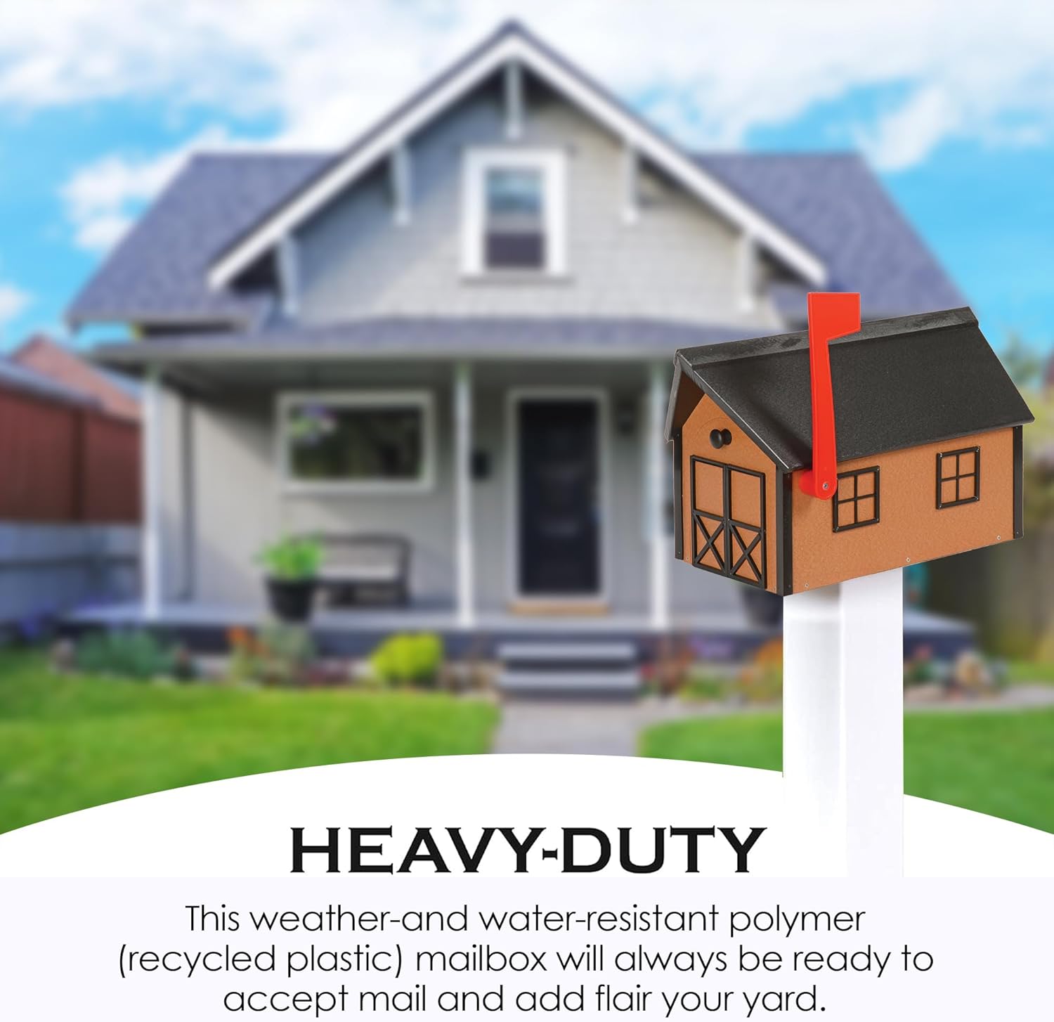 - MADE OF WATER-RESISTANT MATERIAL: Wooden mailboxes may not withstand exposure to the elements so we offer a better alternative. Designed for outdoor uses, our poly-material (recycled plastic) mailbox can hold up in any weather. Rain or shine, this weather- and water-resistant small mailbox will always be ready to accept your mails and decorate your lawn.