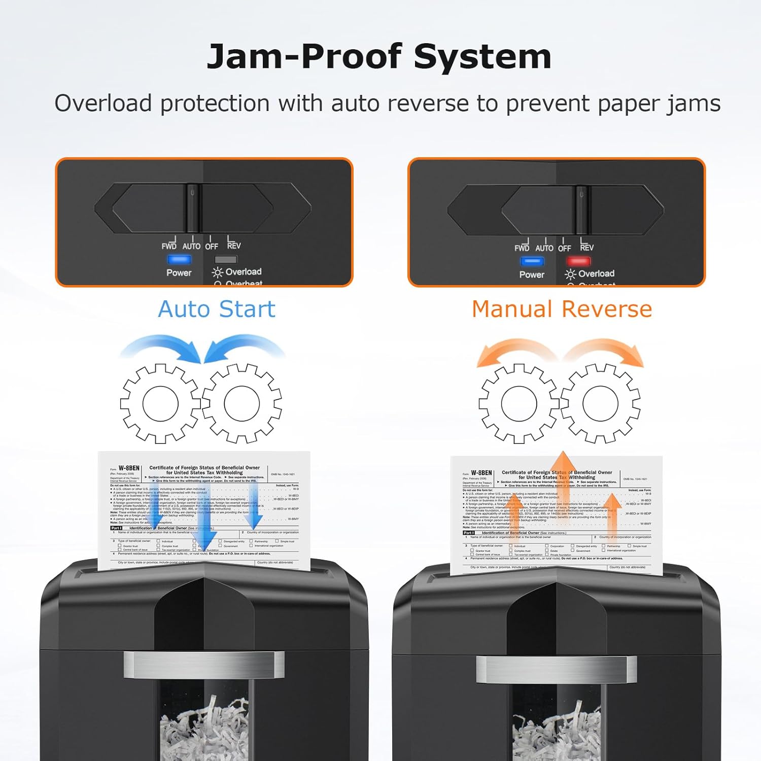 - [Jam Proof & Easy to Operate]bonsaii paper shredder has auto start/stop and manual reverse functions, which helps you clean up paper jams easily or when shred a useful file mistakenly, you can push to "REV" to reverse the paper.