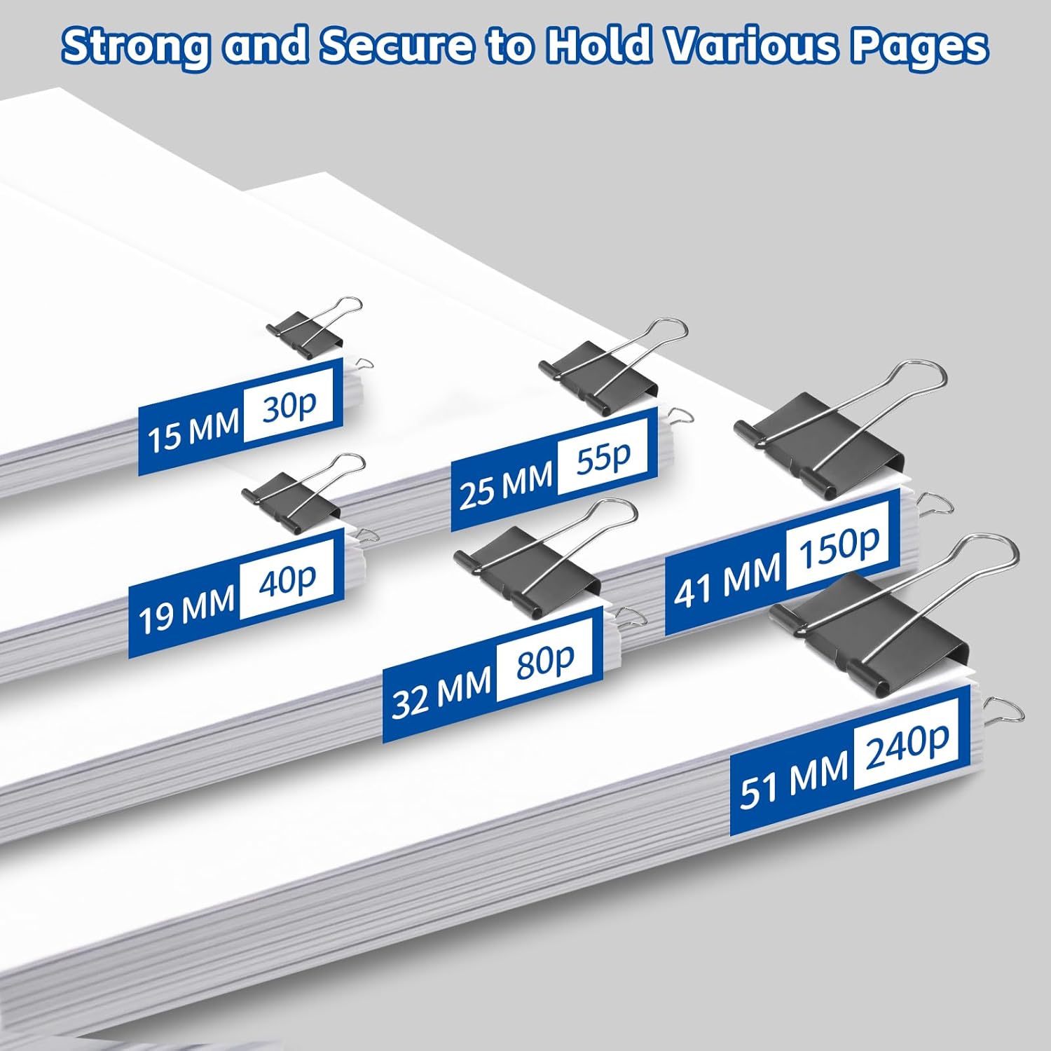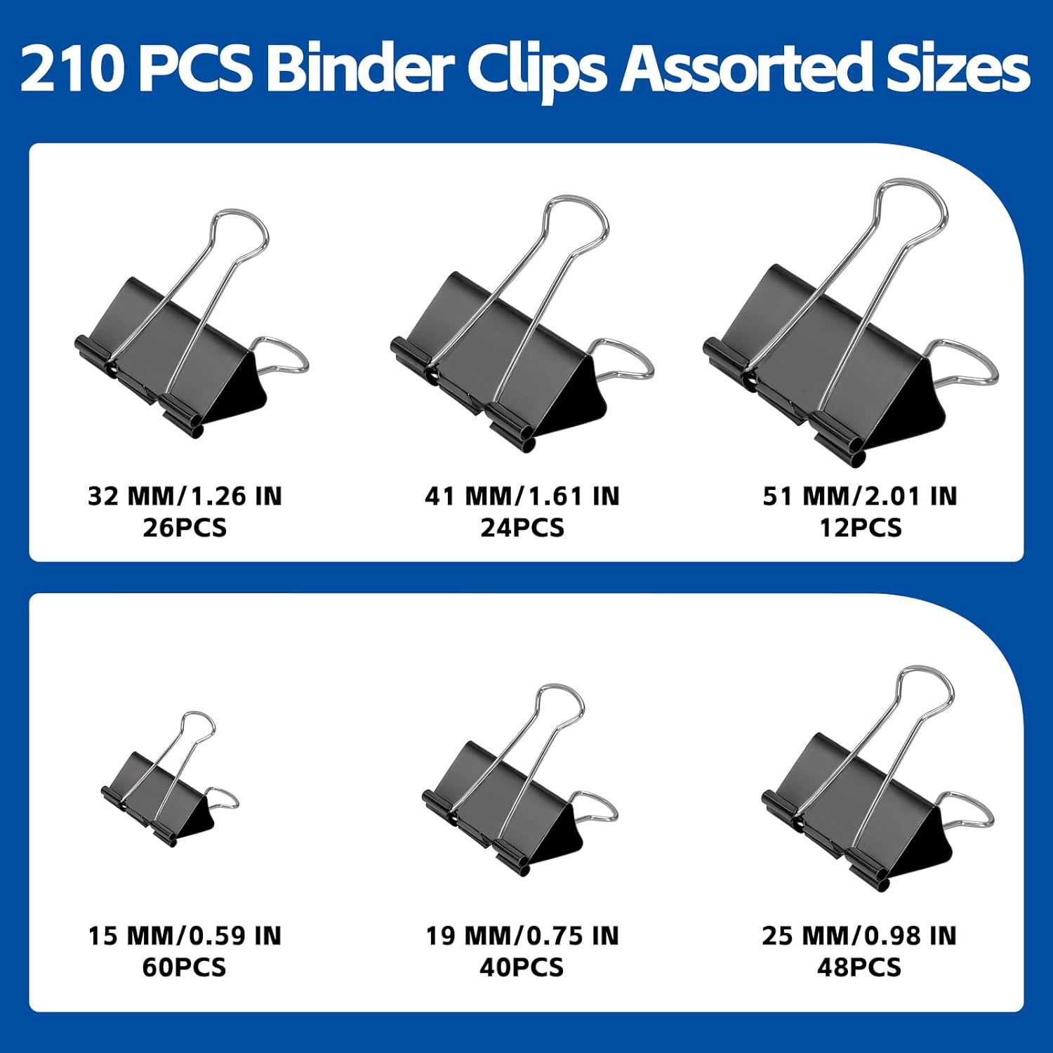 - Binder Clips Size - 2 inch x 12 pcs, 1.6 inch x 24 pcs, 1.26 inch x 26 pcs, 0.98 inch x 48 pcs, 0.75 inch x 40 pcs, 0.6 inch x 60 pcs, assorted size total 210 pcs binder clips kit can meet your different using needs.