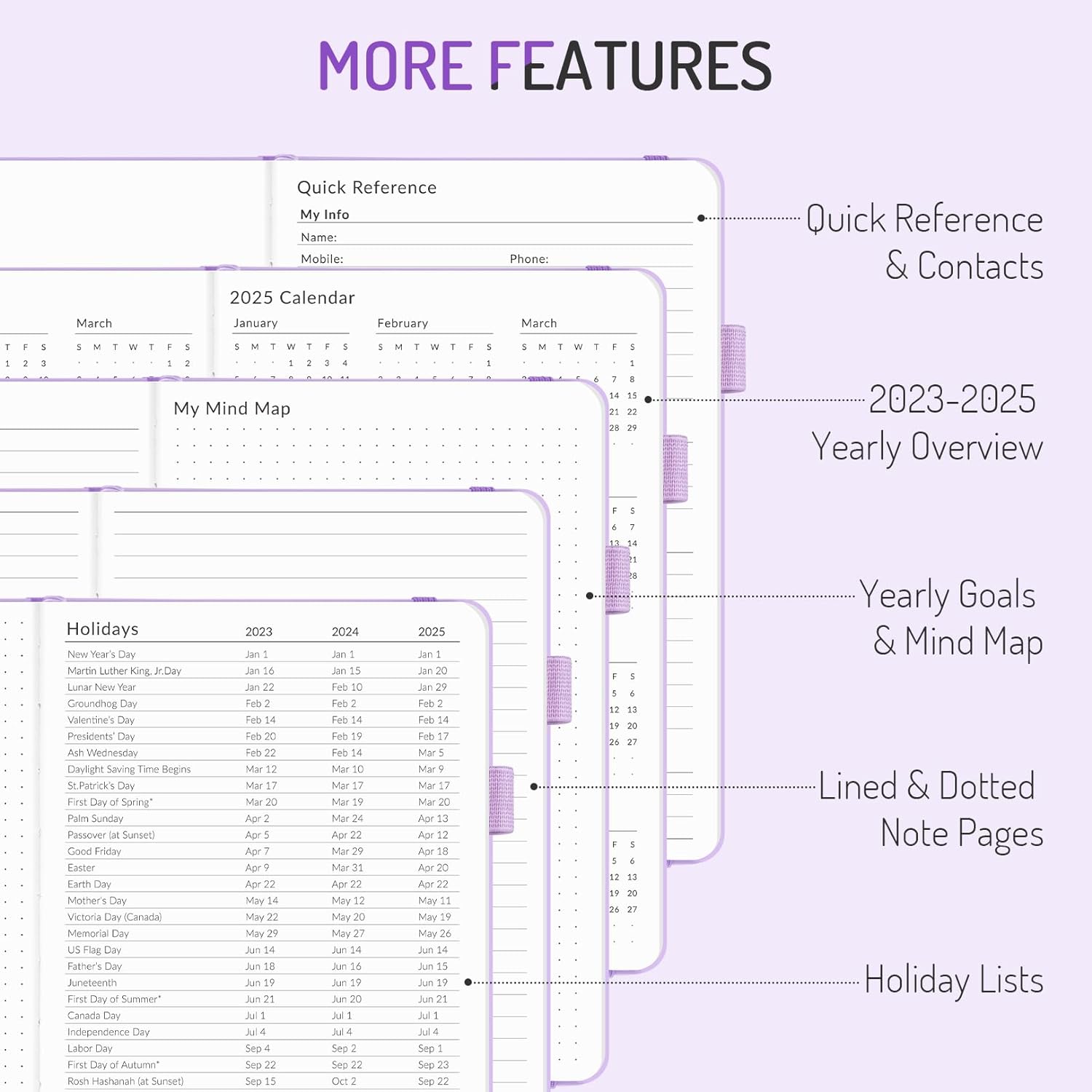 - Additional Planner Features: This calendar planner starts with Yearly Goals and Mind Map pages for goal setting and thoughts organization. It also includes holiday lists to keep on top of your special dates, contact page and extra notes pages to jot down your thoughts.
