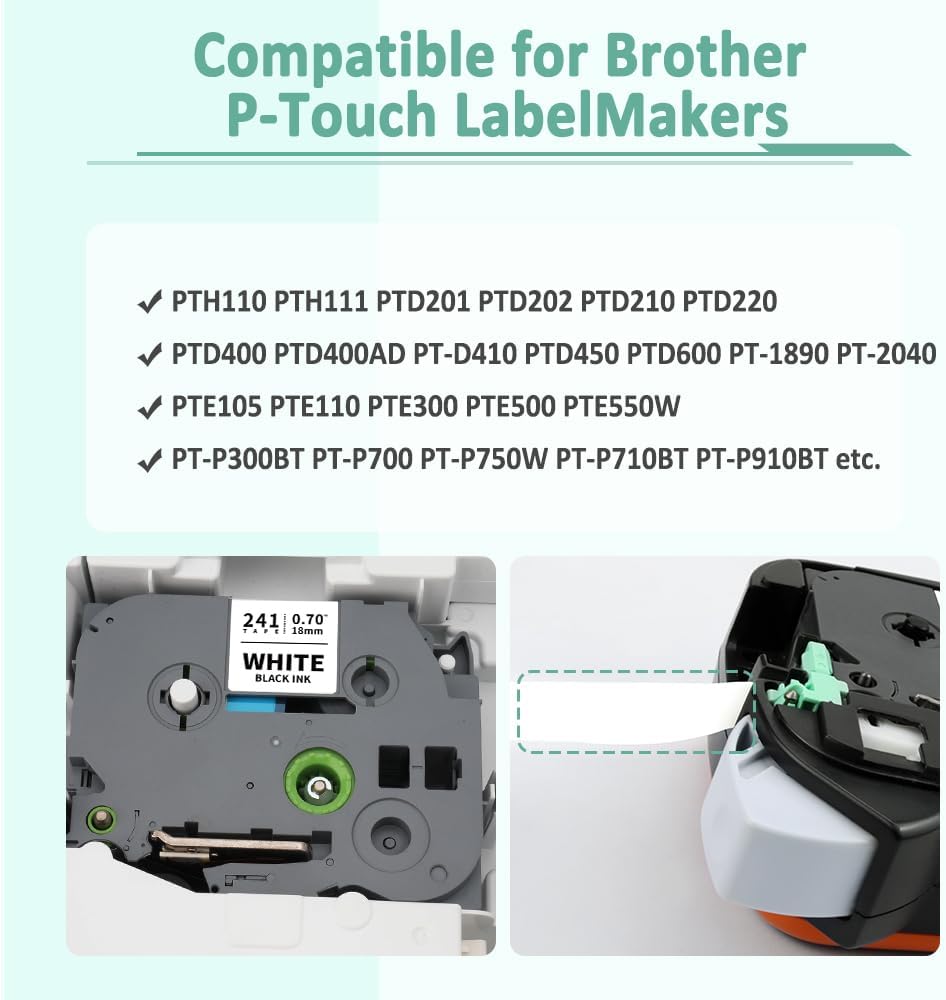 - Compatible for Brother P Touch Tze 18mm Label Makers: PT-D410, PT-D460, PT-D410VP, PT-D610BT, PT-D610BTVP, PT-D600, PT-D400, PT-D450, PT-E300, PT-H300, PT-E500, PT-E550W, PT-H500, PT-P700, PT-P710BT, PT-P715eBT, PT-P750W, PT-18R, PT-18RKT, PT-D800W, PT-E800W, PT-P900, PT-P900W, PT-P950NW, PT-P910BT