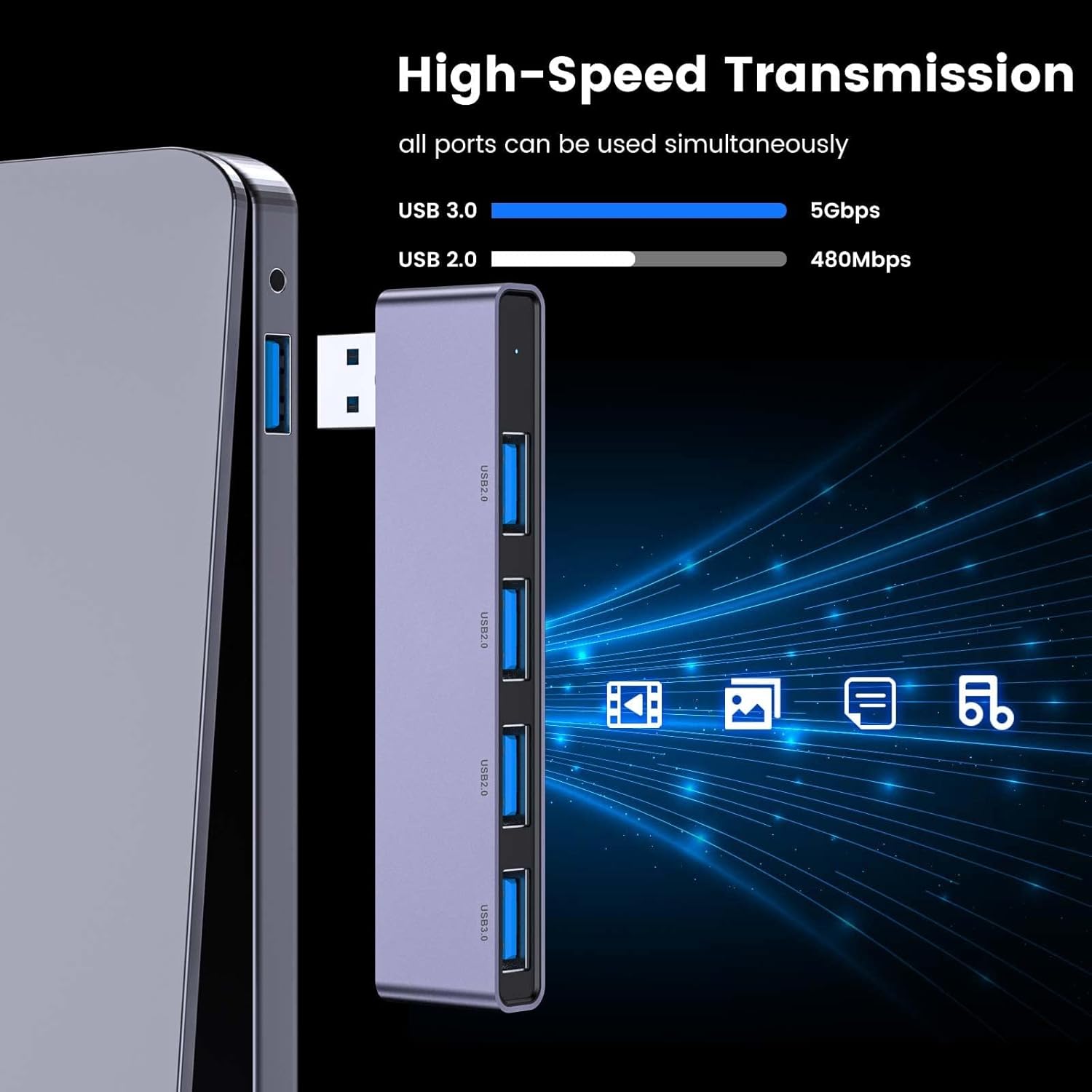 - The Usb port extender support USB3.0 Super Speed: 1*USB 3.0 and 3*USB 2.0. The USB 3.0 supports super faster data transfer up to 5Gbps which is 10X faster than USB 2.0 (480 Mbps), which allows you to transfer datas in just seconds; USB extension hub was built in OTG function chip, it can easily connect the mouse, keyboard, USB disk, and other USB devices.