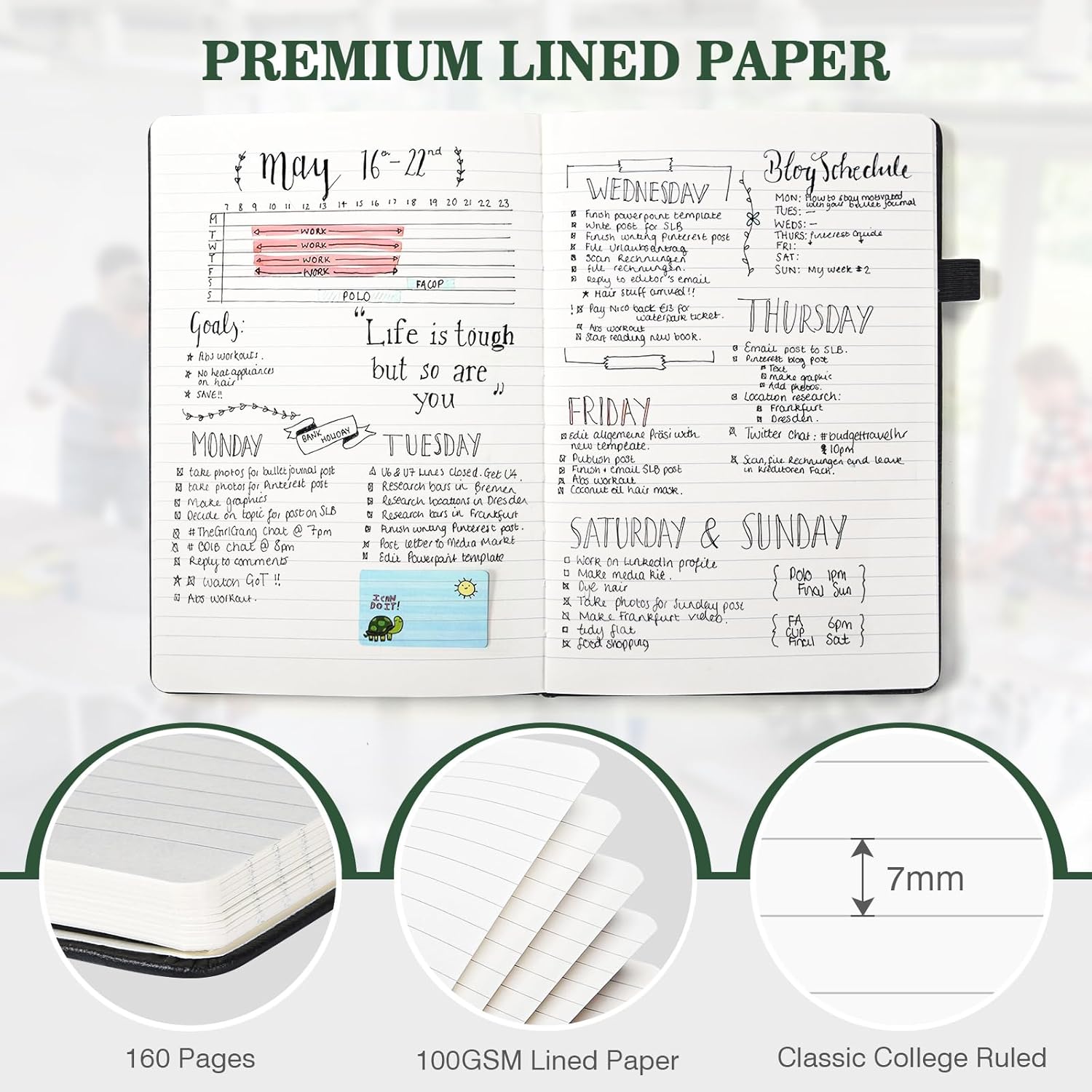 - 【Premium Writing Experience】These lined journals boast 100GSM paper with 80 sheets (160 pages). The paper is compatible with a wide range of pens, ensuring a seamless writing performance without any ink bleed-through. The 7mm line spacing is suitable for most people's writing preferences. Additionally, the pages can lay flat at 180°, allowing for easy note-taking. Ideal for school, office, outdoor activities, and travel.