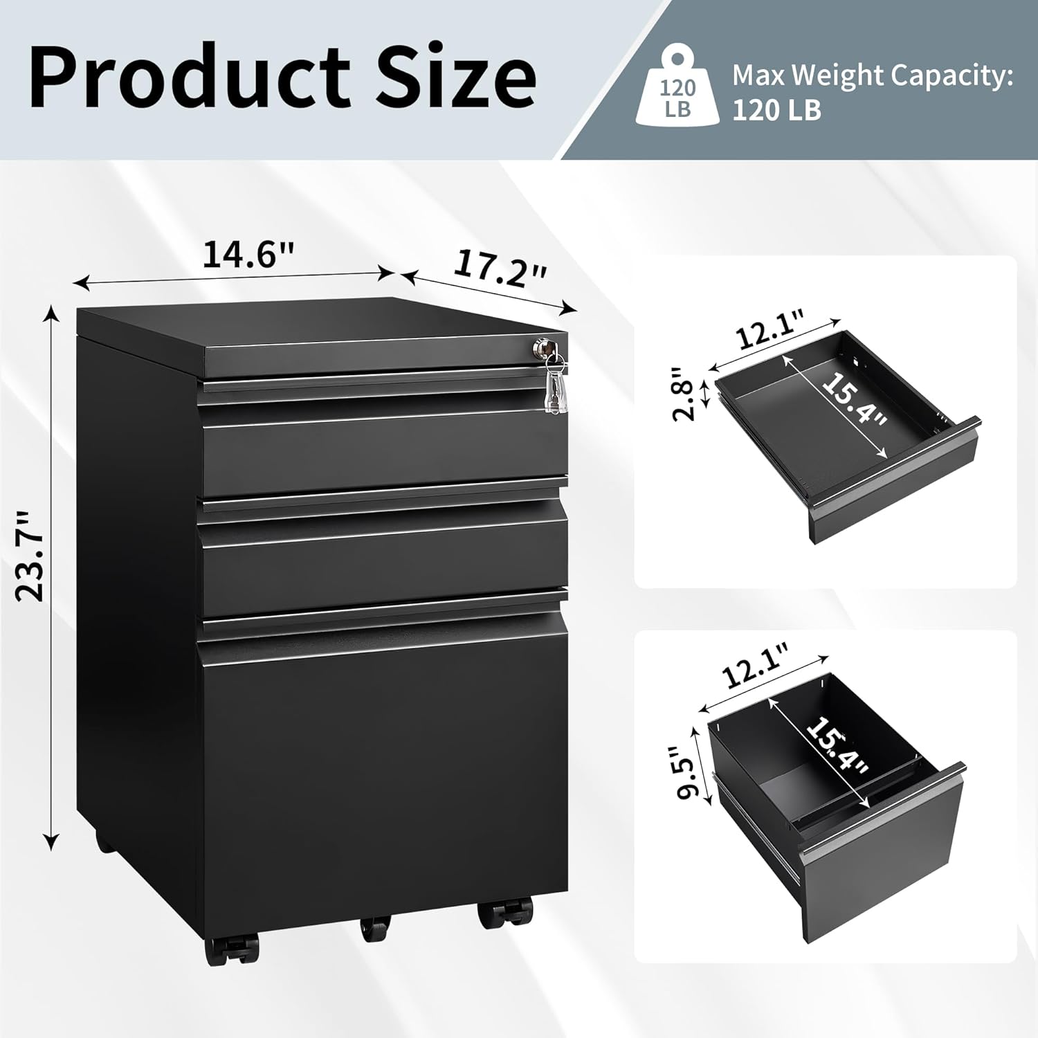 3 Drawer File Cabinet for Home Office, Under Desk Mobile Filing Cabinet with Lock for A4-Size/Letter-Size/Legal-Size, Black (HSEJ-3D)