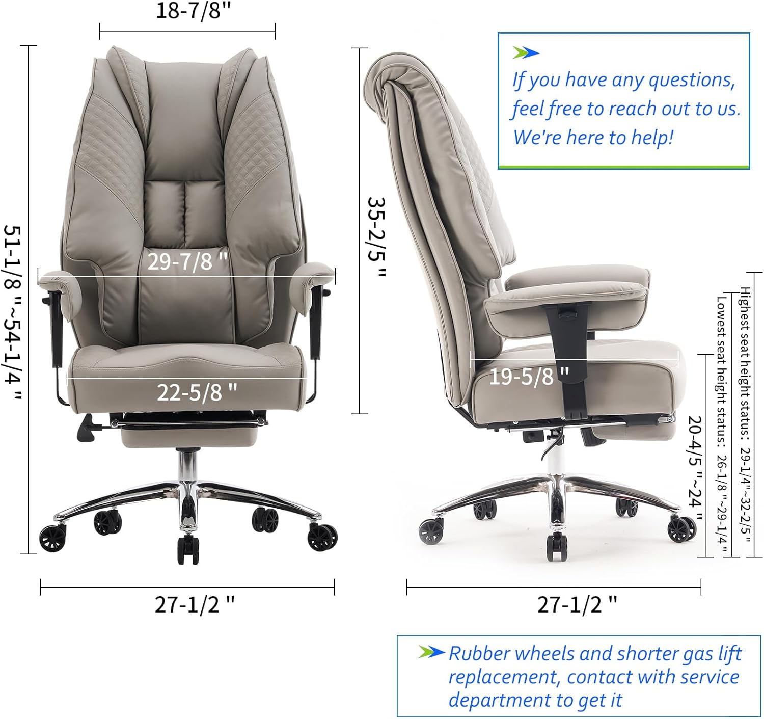 Big and Tall Office Chair 400lbs Wide Seat, Leather High Back Executive Office Chair with Foot Rest, Ergonomic Chairs Lumbar Support for Lower Back Pain Relief (Light Grey)
