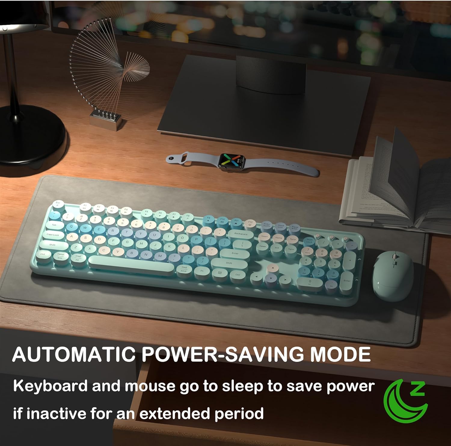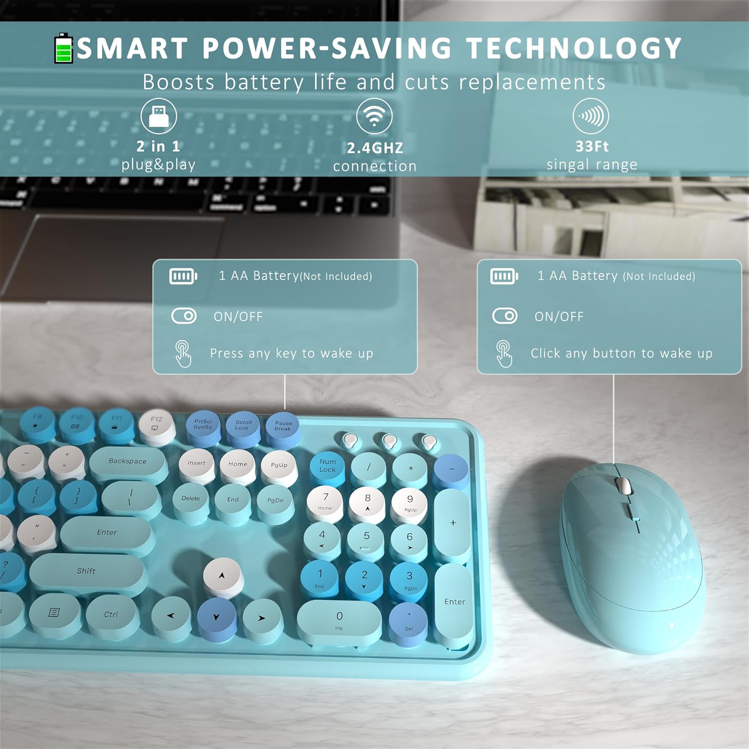 Wireless Keyboard and Mouse, Full-Size Retro Typewriter Keyboard with Round Keycaps, 2.4GHz for Windows, Mac, Laptop, PC, Desktop (Blue Colorful)