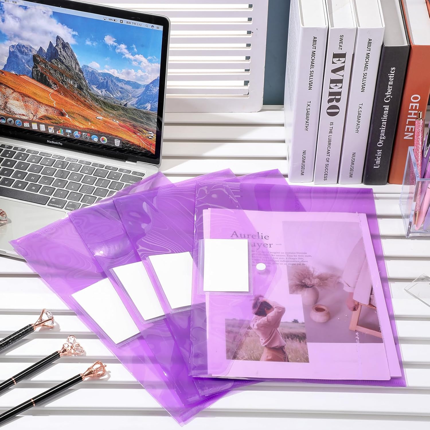 Yeaqee 50 Pcs Plastic Envelopes Poly Envelopes File Folders with Snap Button Closure Clear Folders for Documents US Letter A4 Size Filing Holder with Label Pocket for Home Office School(Purple)