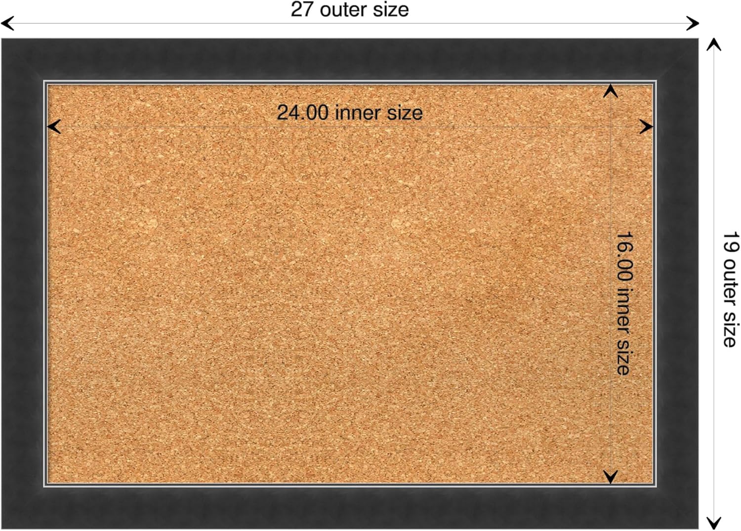 - DIMENSIONS: The overall size of this framed corkboard measures 27 in. x 19 in., including the frame. Its functional cork board area measures 24 in. x 16 in.
