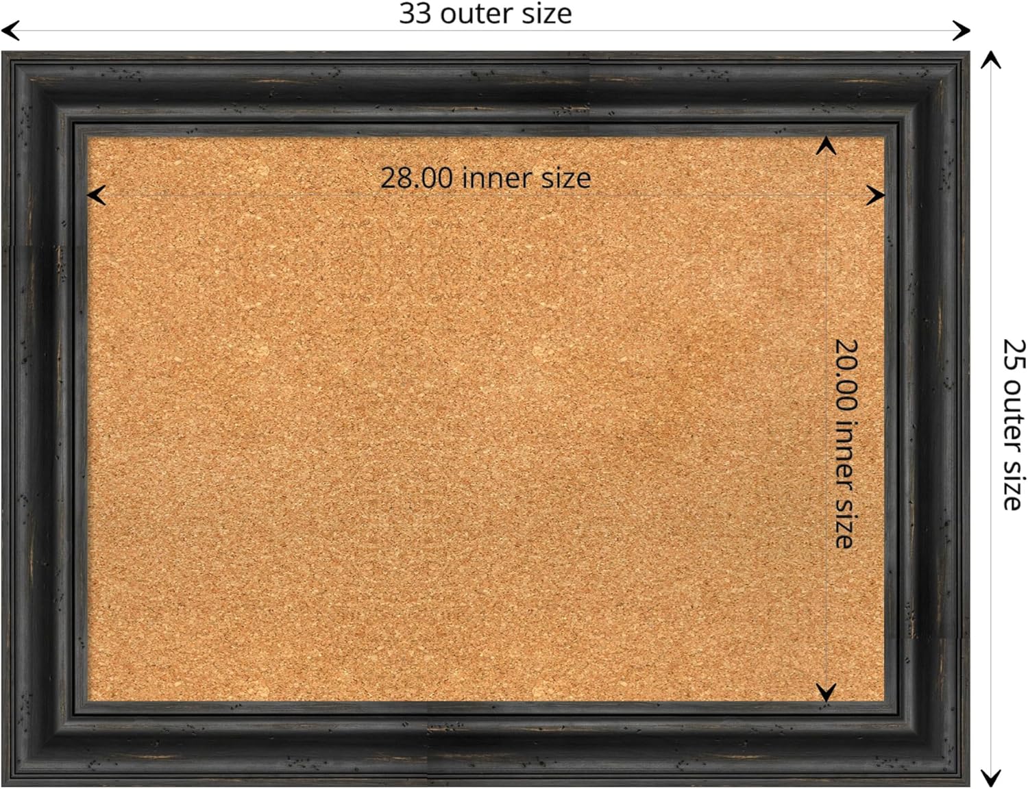 - DIMENSIONS: The overall size of this framed corkboard measures 33 in. x 25 in., including the frame. Its functional cork board area measures 28 in. x 20 in.