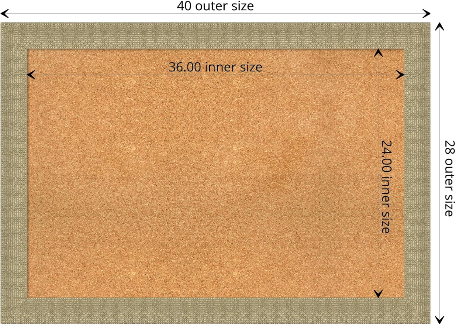 - DIMENSIONS: The overall size of this framed cork board measures 40 in. x 28 in., including the frame. Its functional cork board area measures 36 in. x 24 in.