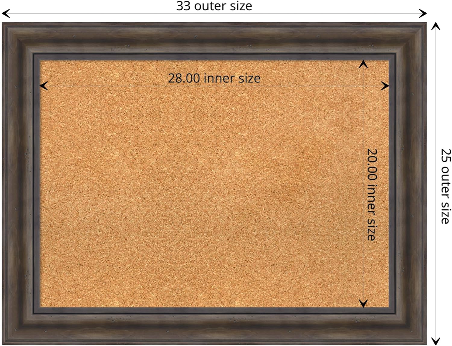 - DIMENSIONS: The overall size of this framed corkboard measures 33 in. x 25 in., including the frame. Its functional cork board area measures 28 in. x 20 in.
