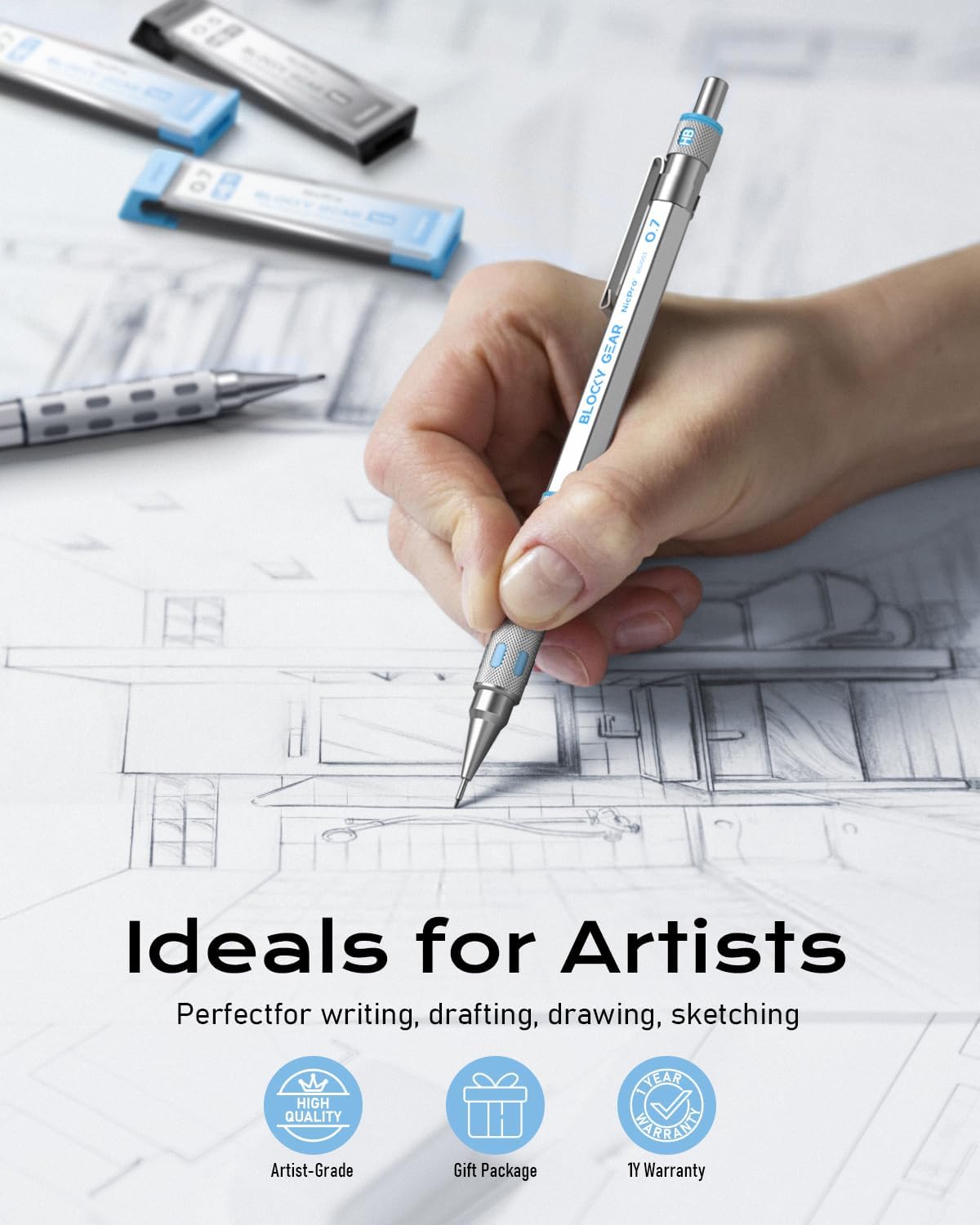 Nicpro Blocky Gear 0.5 mm & 0.7 mm Mechanical Pencils Set in Case, Metal Pencil with 6 Tube Lead Refills, Eraser, Eraser Refills for Professional & Adult Art Writing Drafting Drawing Sketching