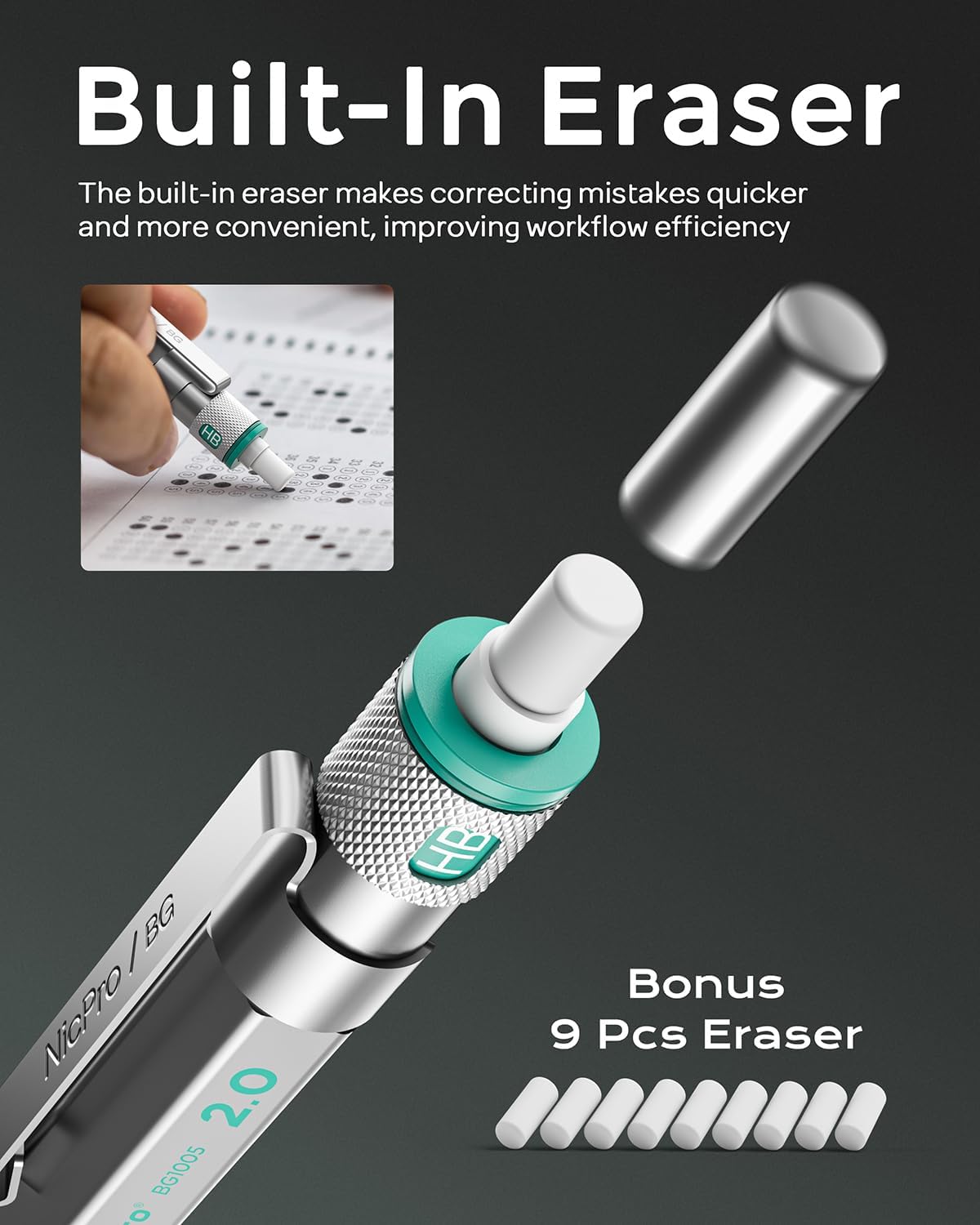 - Nicpro Blocky Gear :Come with 3 pack metal 2mm mechanical pencil and 13 tube of 2.0 mm lead refills in different hardness(HB 2B 2H 4B 4H 6B & 12 Colors),3pcs 4B latex-free eraser,18pcs replaceable cap erasers,1pcs kneaded eraser, 2pcs lead sharpeners, all the stuff storage neatly in a case with flocking tray,what a gift for friends & family!