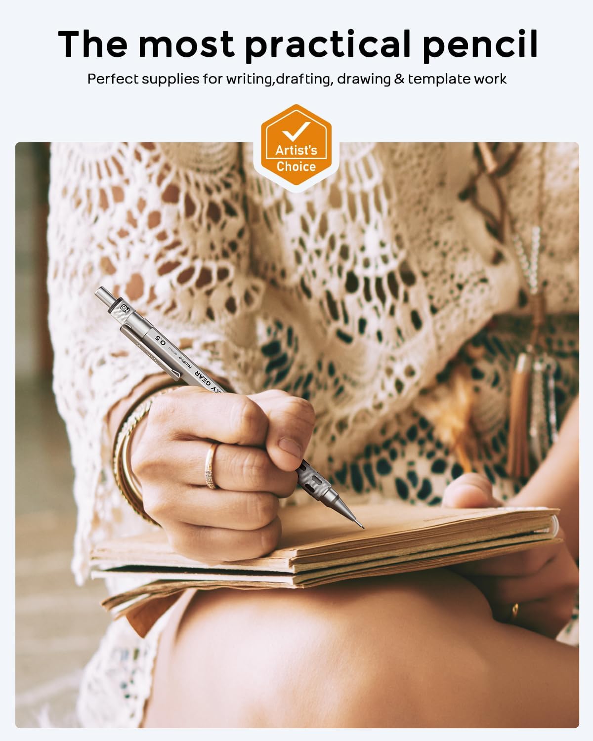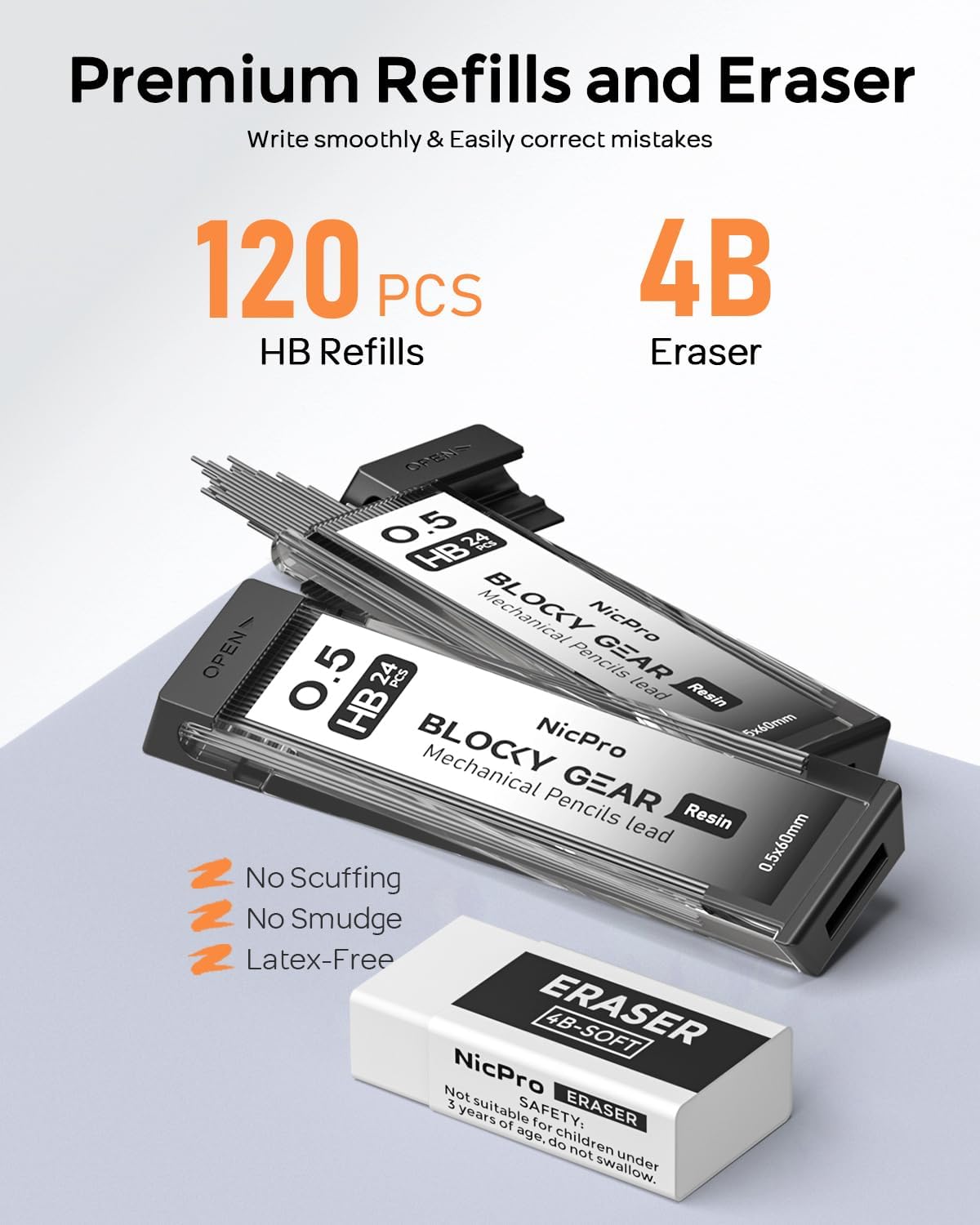 - Nicpro Blocky Gear:Come with a metal 0.5mm mechanical pencil and 2 tube of 0.5 mm HB lead refills,60pcs / tube,1pcs 4B latex-free eraser,9pcs replaceable cap erasers,all the stuff storage neatly in a case with flocking tray,what a gift for friends & family!