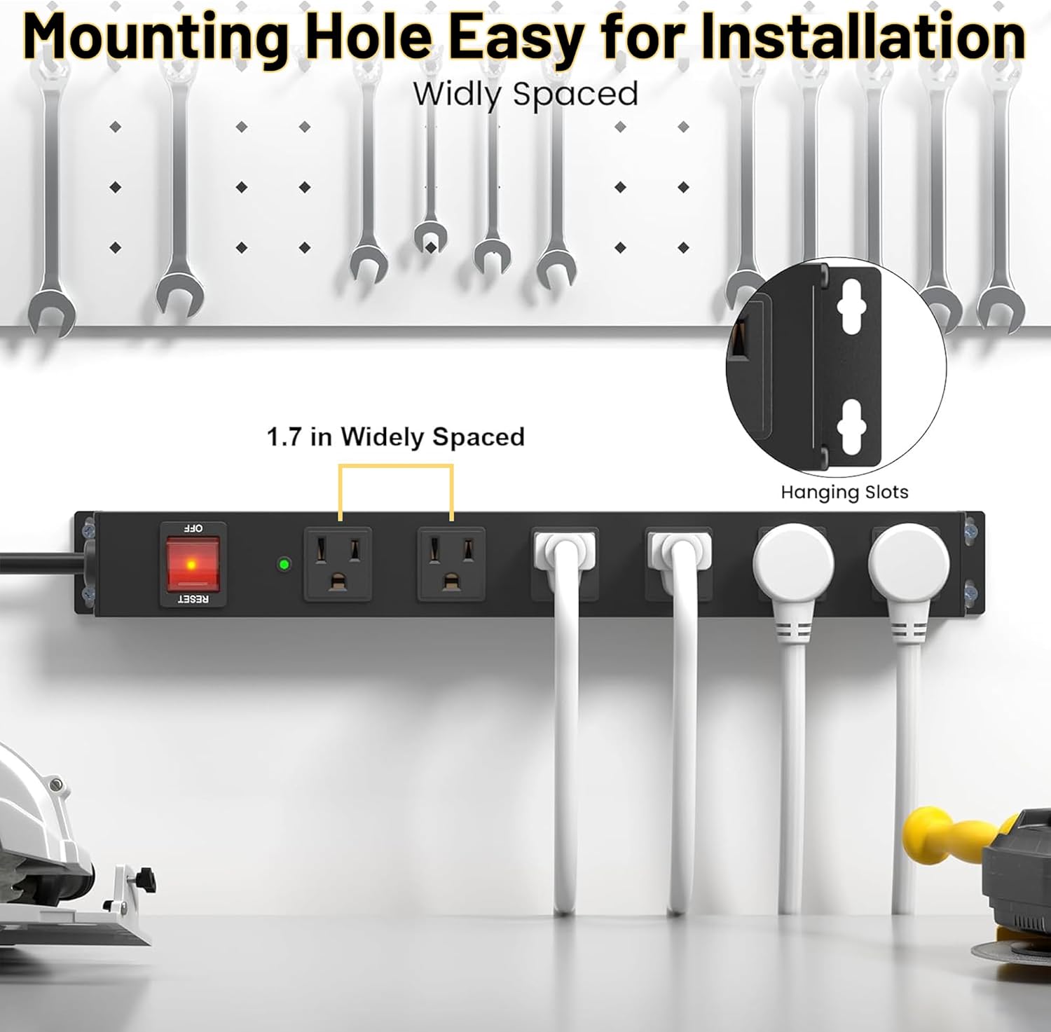- Wall Mount Metal Power Strip: Mounted it on the wall or under-desk mounting on standing desks, making it perfect for your garage, office, or industrial setup. Whether it's at home, in an office, or in an industrial environment, this power strip is designed to meet your diverse power needs, catering to different settings effectively.