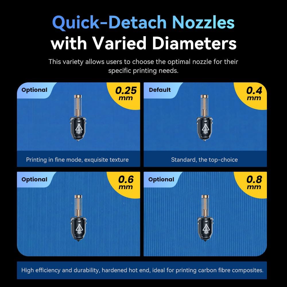 - Patent Quick-Detachable Nozzle: Different nozzle diameter options (0.25/0.4/0.6/0.8 mm) are suitable for both high precision and high-efficiency modes. Quick change nozzle requires no tools and can be changed in as little as 3 seconds. Easy to maintain nozzle for both the novice and the expert.