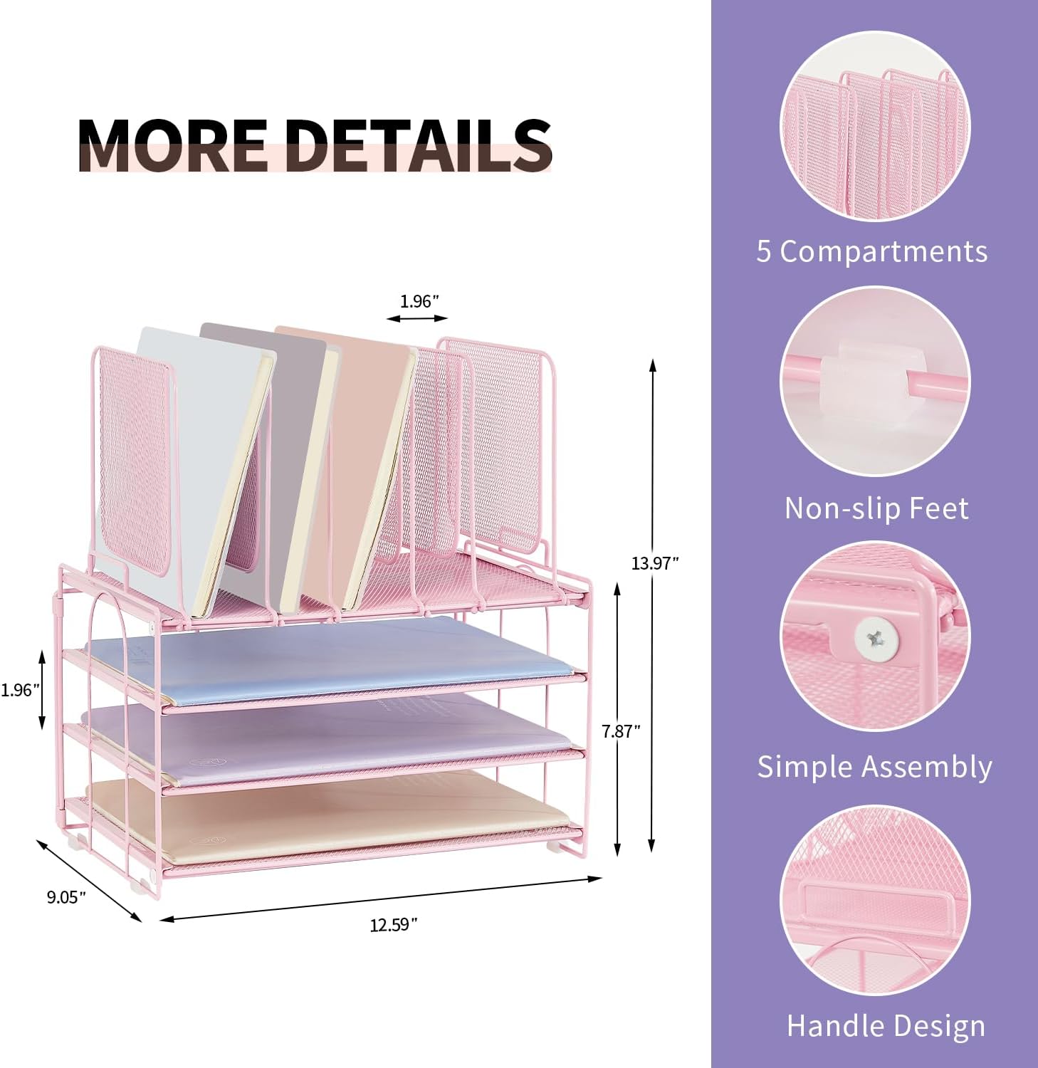 Paper Desk Organizer, 3-Tier Letter Tray with 5 Vertical File Holders, Multifunction Desktop Folder Organizers and Accessories for Home Office(Pink), LK-3CB