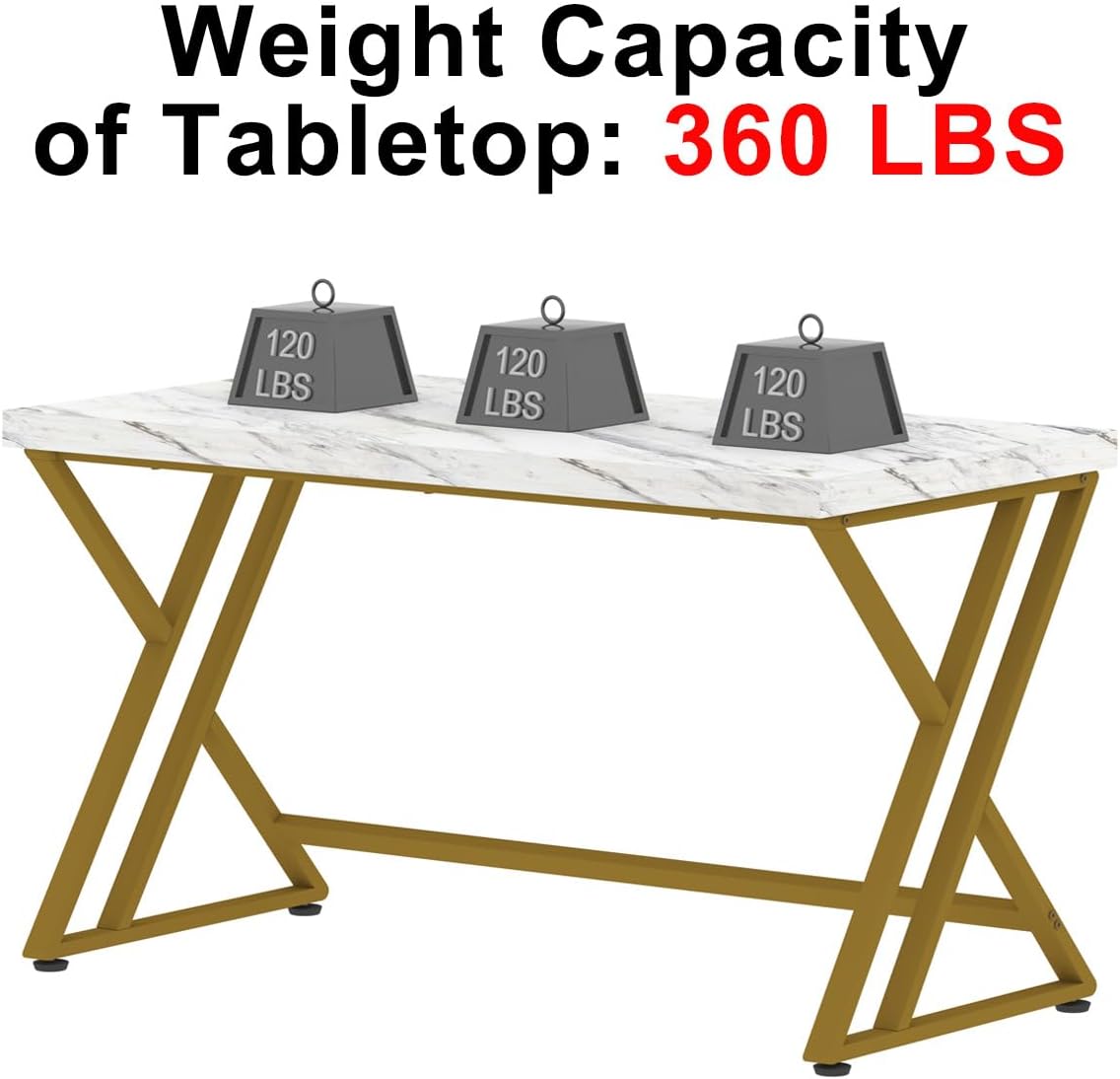 LVB White and Gold Desk, Wood Faux Marble Home Office Computer Desk, Modern Study Executive Table for Gaming Writing, Metal Simple Student Desk for Bedroom, White Marble and Gold, 55 Inch