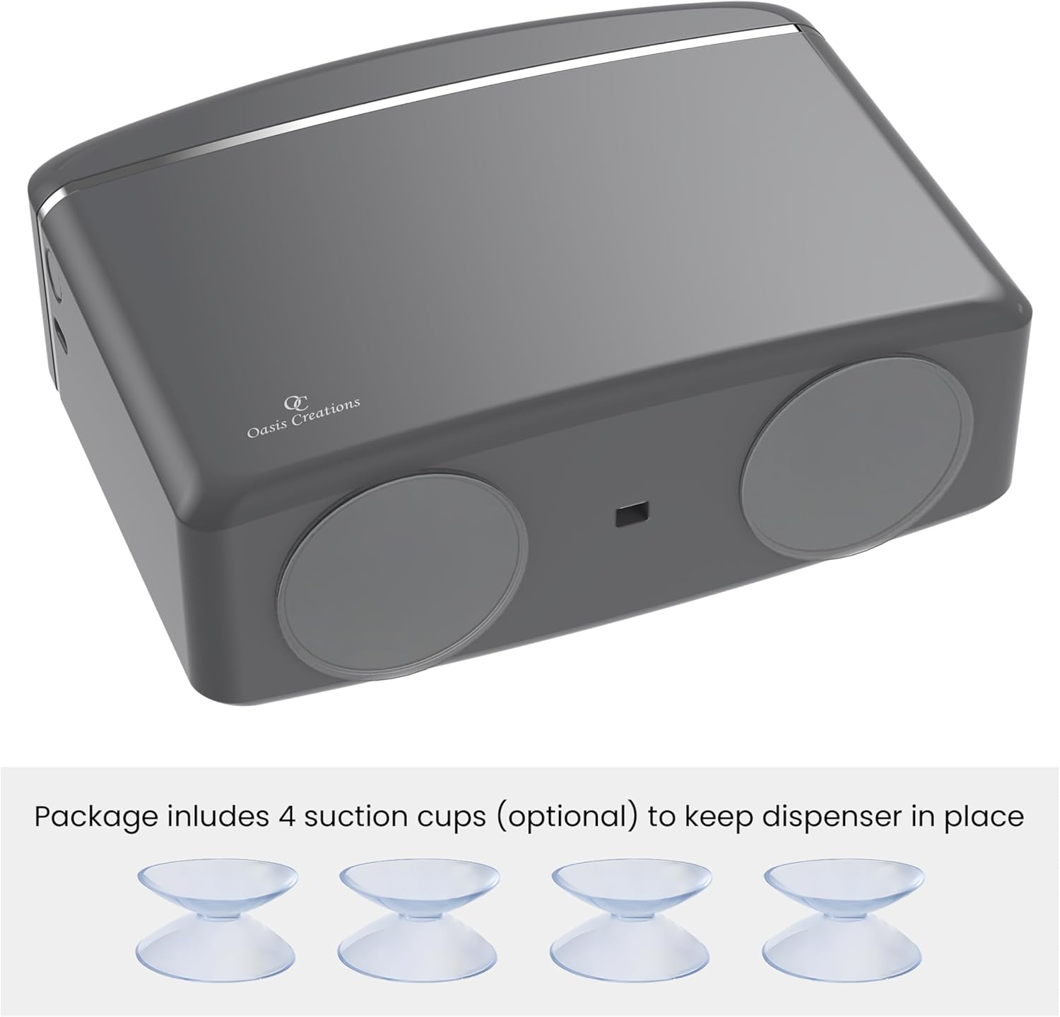 - SUCTION CUPS INCLUDED: 4 suction cups included (optional to use) to keep dispenser in place. This dispenser features a glossy black color and a sleek gold trim around the top. It has soft round edges and an eye catching high gloss coating. It’s modern, stylish, and such a necessity!
