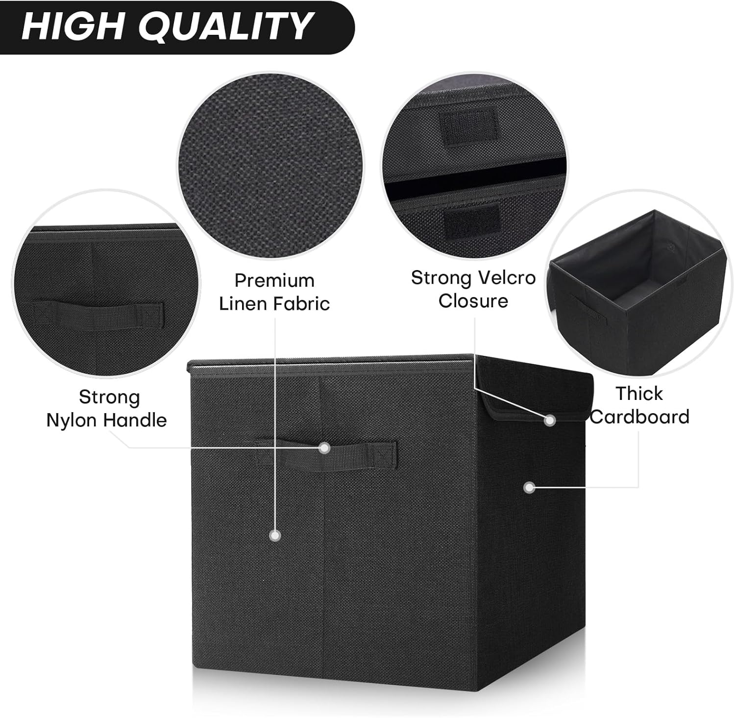 Large 22 Quart Linen Fabric Foldable Storage Bin Cube Organizer Basket with Flip-Top Lid & Handles, Clothes Blanket Box for Home, Office, Closet, Black, 4 Pack 14.6 x 9.5 x 9.5”