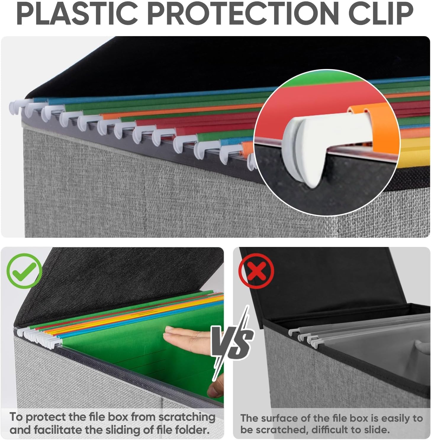 - [UNIVERSAL SIZE] Our file box with lid fits letter-sized files. It is designed for efficiency and functionality, with its smooth PVC slide rails on both sides, you can effortlessly slide file folders for easy access and neatly arranged. The lid fits snugly on the box after hanging folders. (NOTE: file folders are not included)
