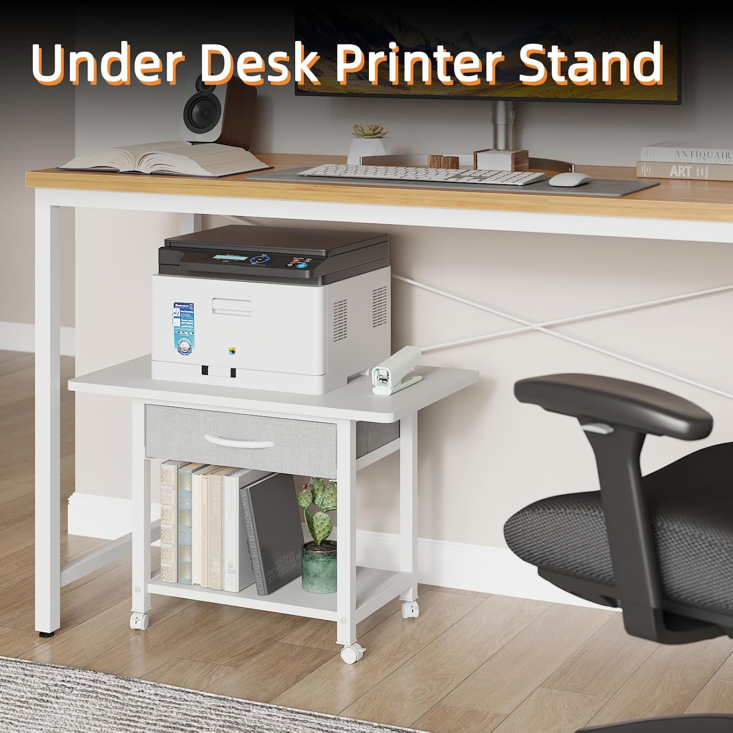 - 【Large Printer Stand】Size:22"L×15"W×15.8"H. Large spacious tabletop can fit most printers: fax machines,3D printers,scanner and other office supplies. Not only a printer stand for desk, you can use it as a end table for the bedroom,living room, and a desktop organizer for your kithcen, office.