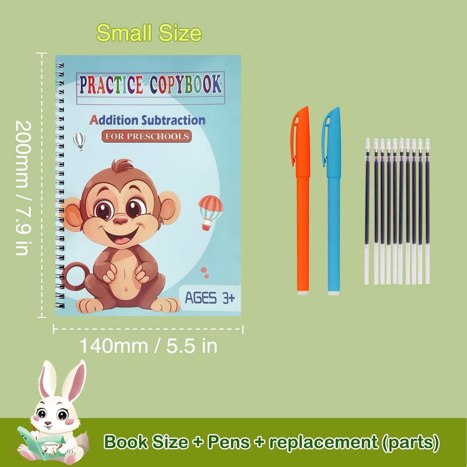 - Magic Reusable Handwriting Workbooks The package includes 5 magic practice copybooks for Kids (Alphabet,Addition Subtraction,Multiplication Division,Number 1-100, Drawing) + 2 Pens + 2 Pen Holding Aids + 10 refills