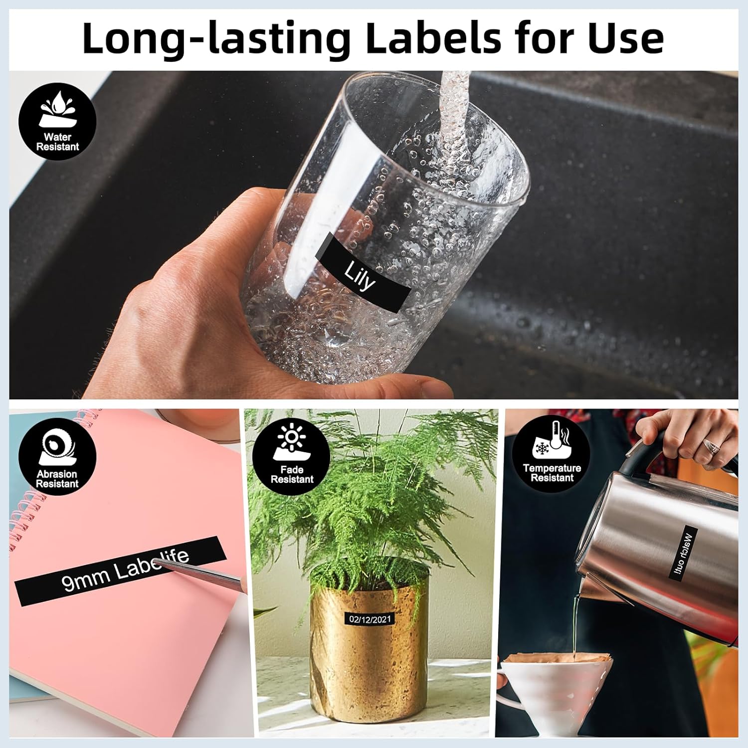- Features: Compatible with Brother label maker tape 9mm black is laminated tape, it has features of withstand water/ abrasion/ temperature/ fading. Split backing makes the labels easy to peel. No sticky residue remains when the labels are removed