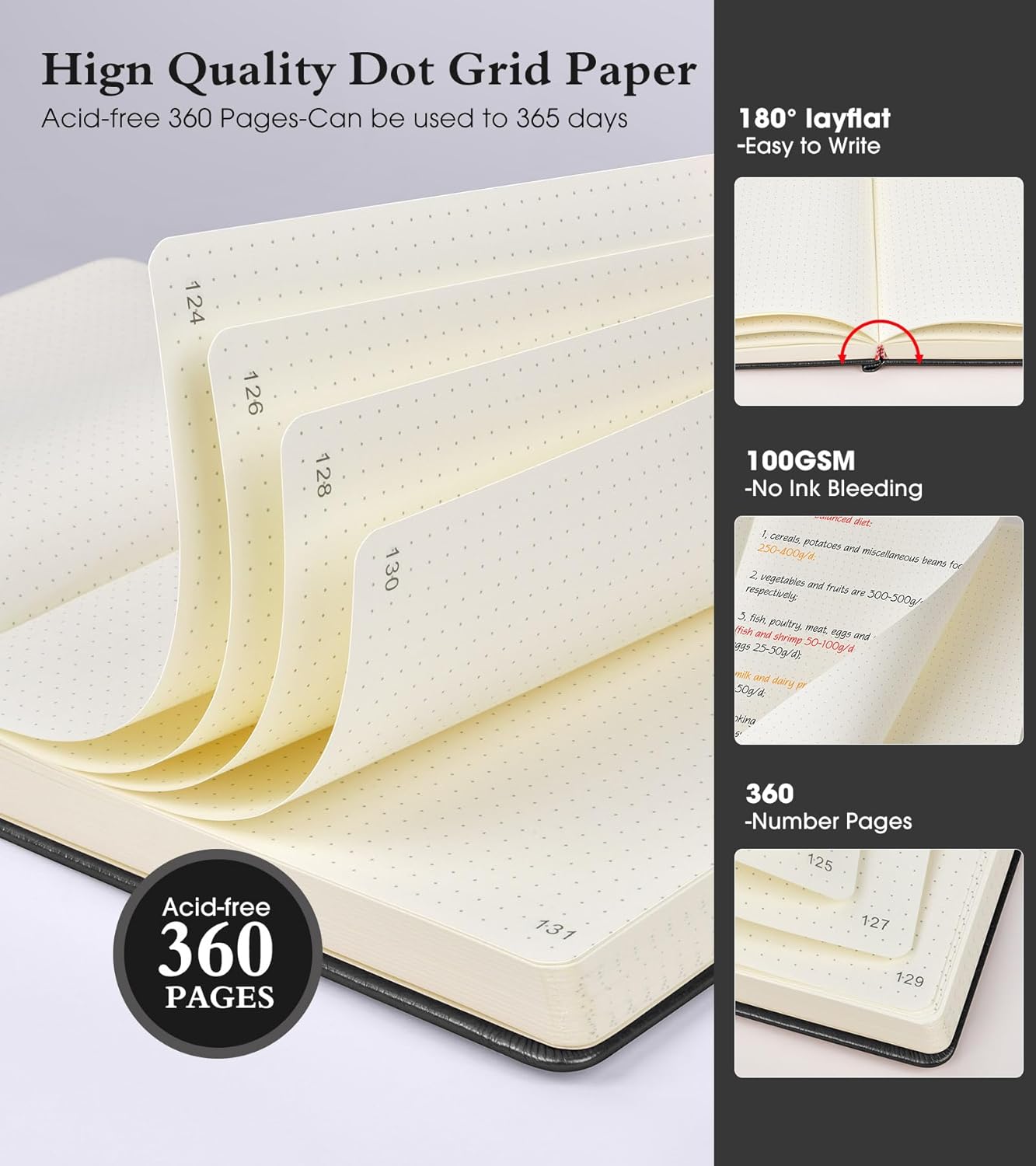 - ă180°Lay Flat Dot Notebookă The 180° lay flat design makes writing easier, reading more convenient, and taking notes more efficient.At the same time, the bullet dot journal is designed with1 elastic closure band & 1 elastic bookmark band. to make it tightly closed to protect your content, and the inner paper will not be curled and kept flat.