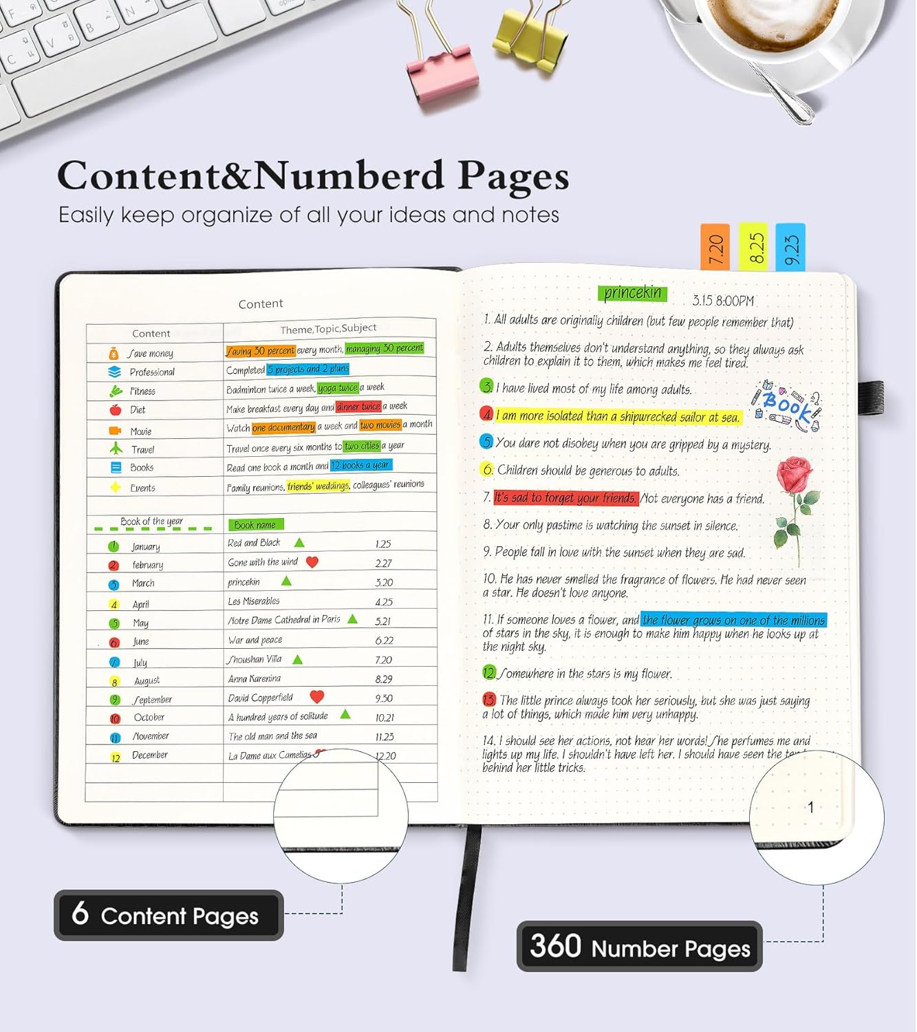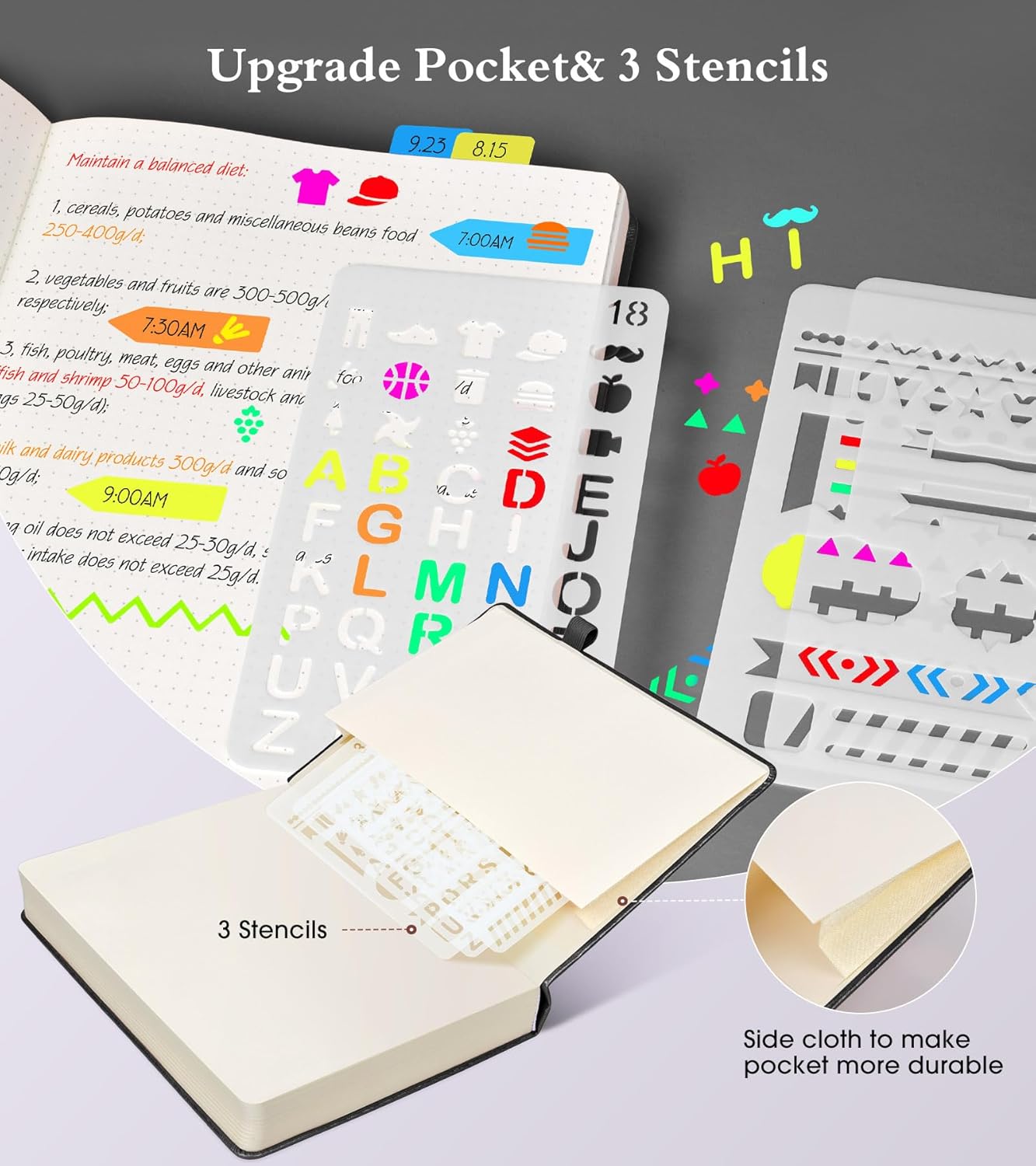 - ăHumanized Designă â¶ 360 numbered pages, 6 contents pages, you can easily keep organize of all your ideas and notes.â·2 3 stencils for journaling (5.4''*8.07'') help you to make page layout and artistic creation better and faster. 2 Bookmarks to help you find important content faster..âž Back Inner pocket can holds notes, business cards, small gadgets, etc. âč Closes with an elastic band, Pen holder loop for any pen.