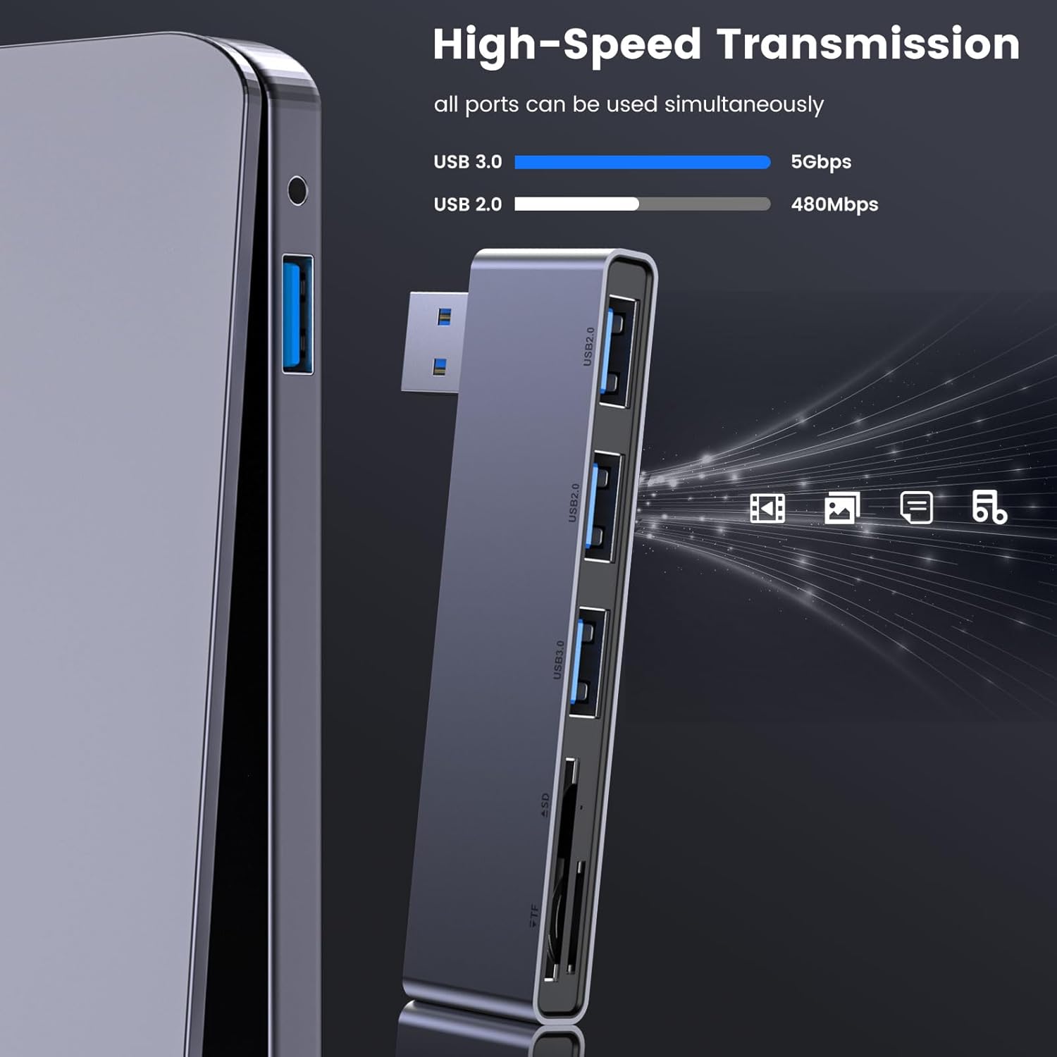 - ă5 in 1 USB Hubă USB Hub tansfer a single USB A port into 5 data ports(1 USB 3.0 & 2 USB2.0 & TF/SD). Support 4 ports to work at the same time(Note: SD card and Micro SD card cannot be read at the same time), without any pressure, and keep the temperature in the middle range. Plug and play, no need driver, easy to use.