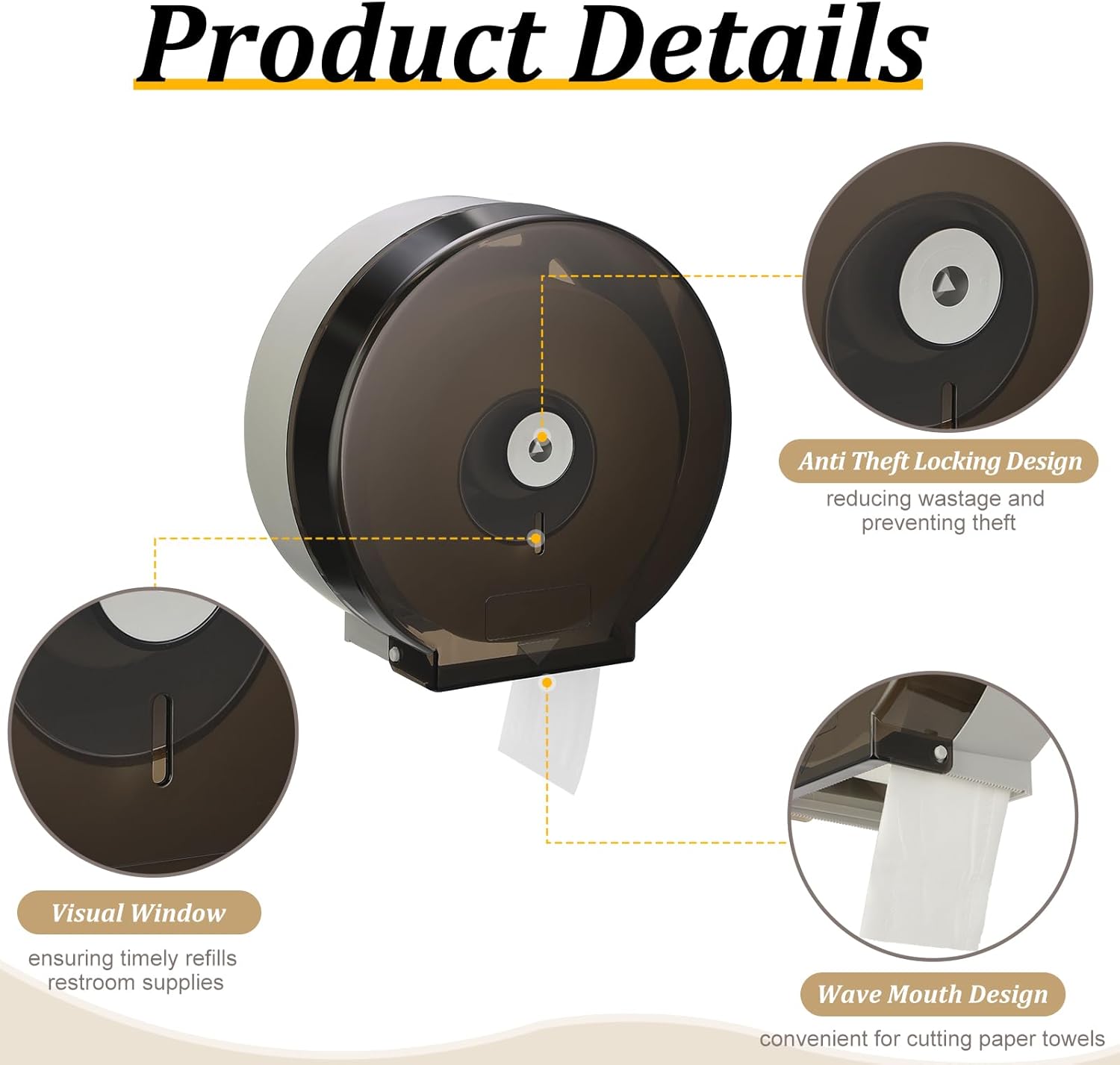 - Anti Theft Locking Design: the commercial toilet paper dispenser is designed with a locking key; The key plays a critical role in reducing wastage and preventing theft, making it an ideal choice for public restrooms; With this unique design, you can maintain efficiency and cleanliness in high traffic areas
