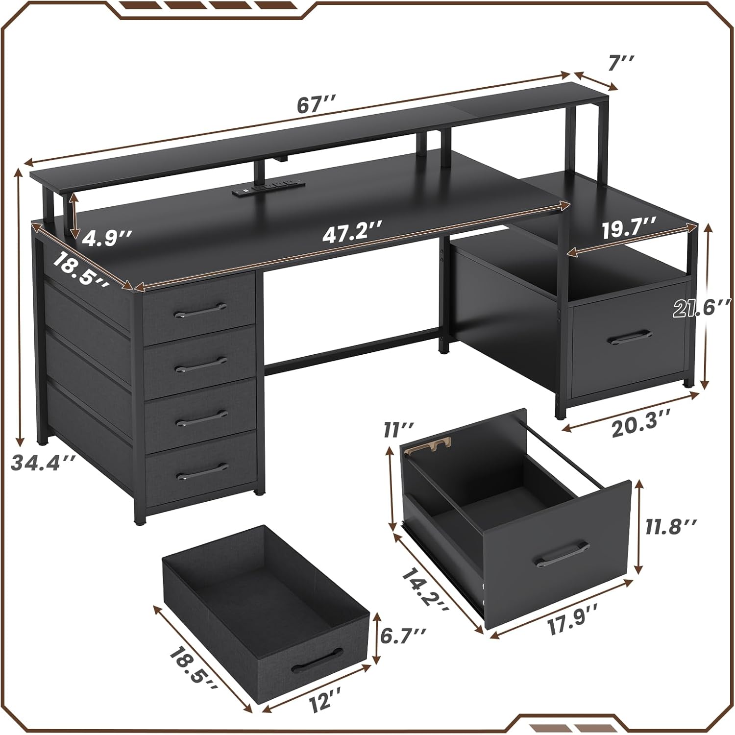 - ăMultifunctional Computer DeskăCreate a versatile workstation thatâll meet all your needs with this all-in-one office desk with large computer desktop, monitor riser, file drawer, 5 storage drawers, power outlet, printer cabinet and led light; An ideal desk for small rooms or limited spaces to create excellent home office space.