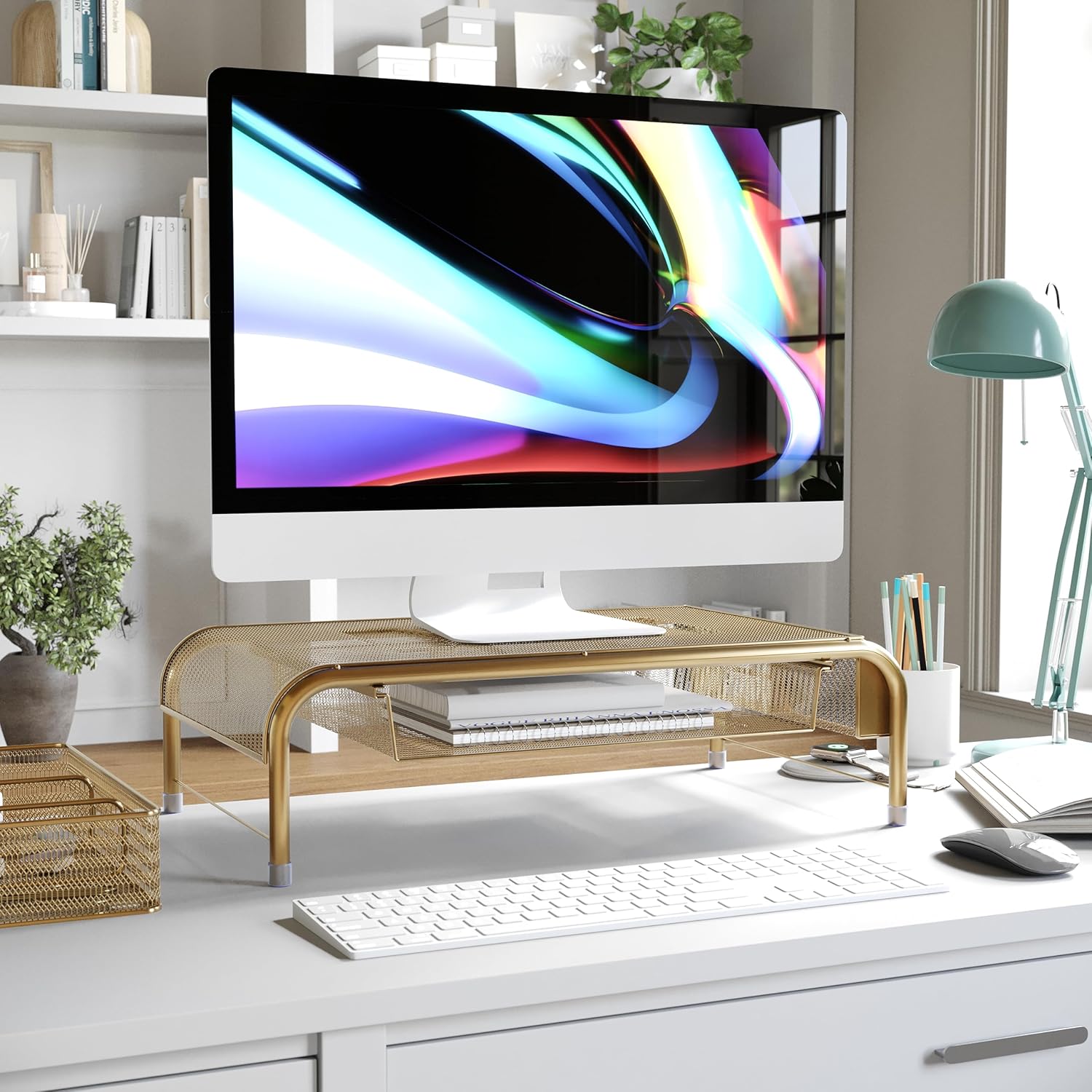 Martha Stewart Ryder Gold Mesh Metal Desktop Monitor Stand Riser with Organizer Drawer and Side Storage, 12.5 x 22.25 x 6.5 inches