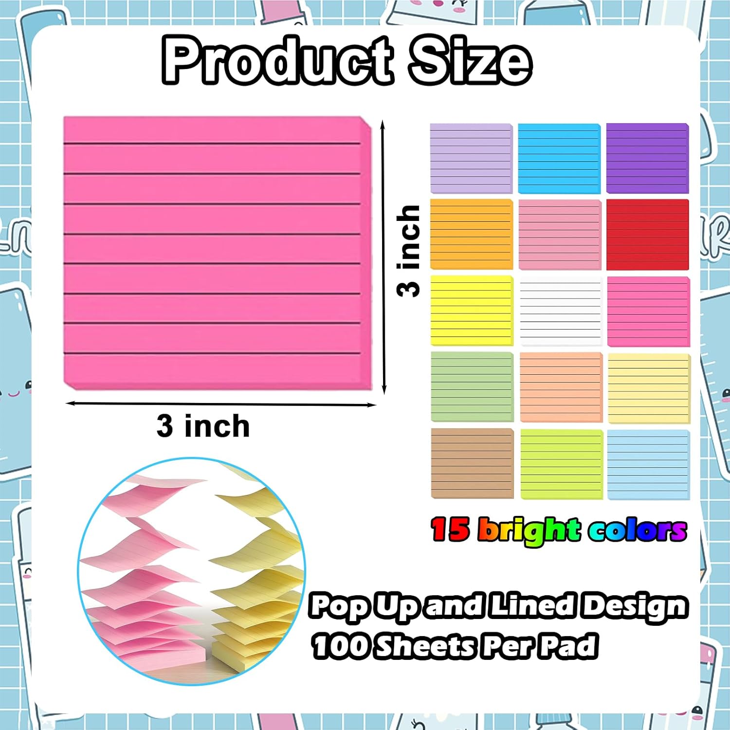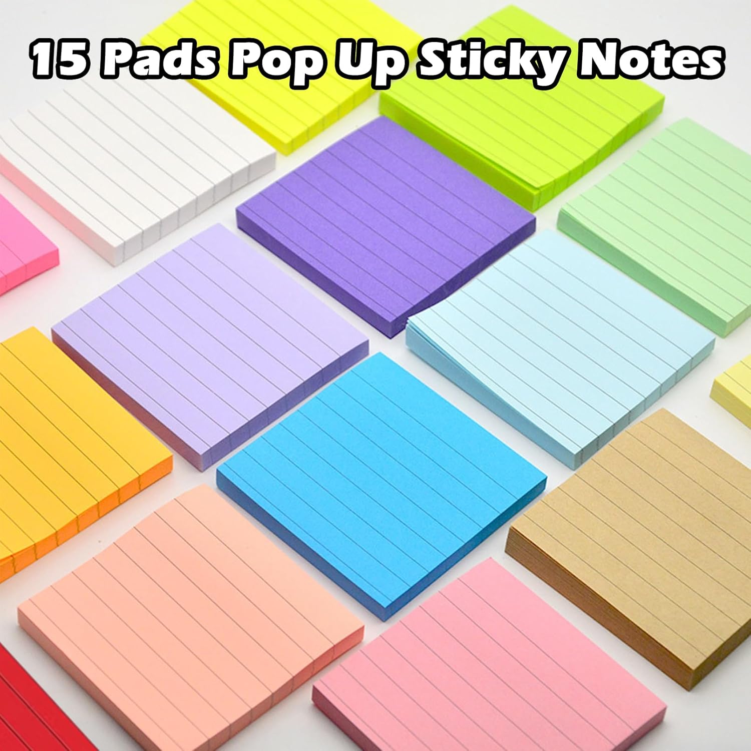 15 Pads Pop Up Sticky Notes,15 Bright Colors Self-Stick Notes Pads with Lines,1500 Sheet Lined Sticky Notes 3x3 Inch Pop up Refills,Clean Removal,Assorted Pastel Colors,100 Sheets/Pad
