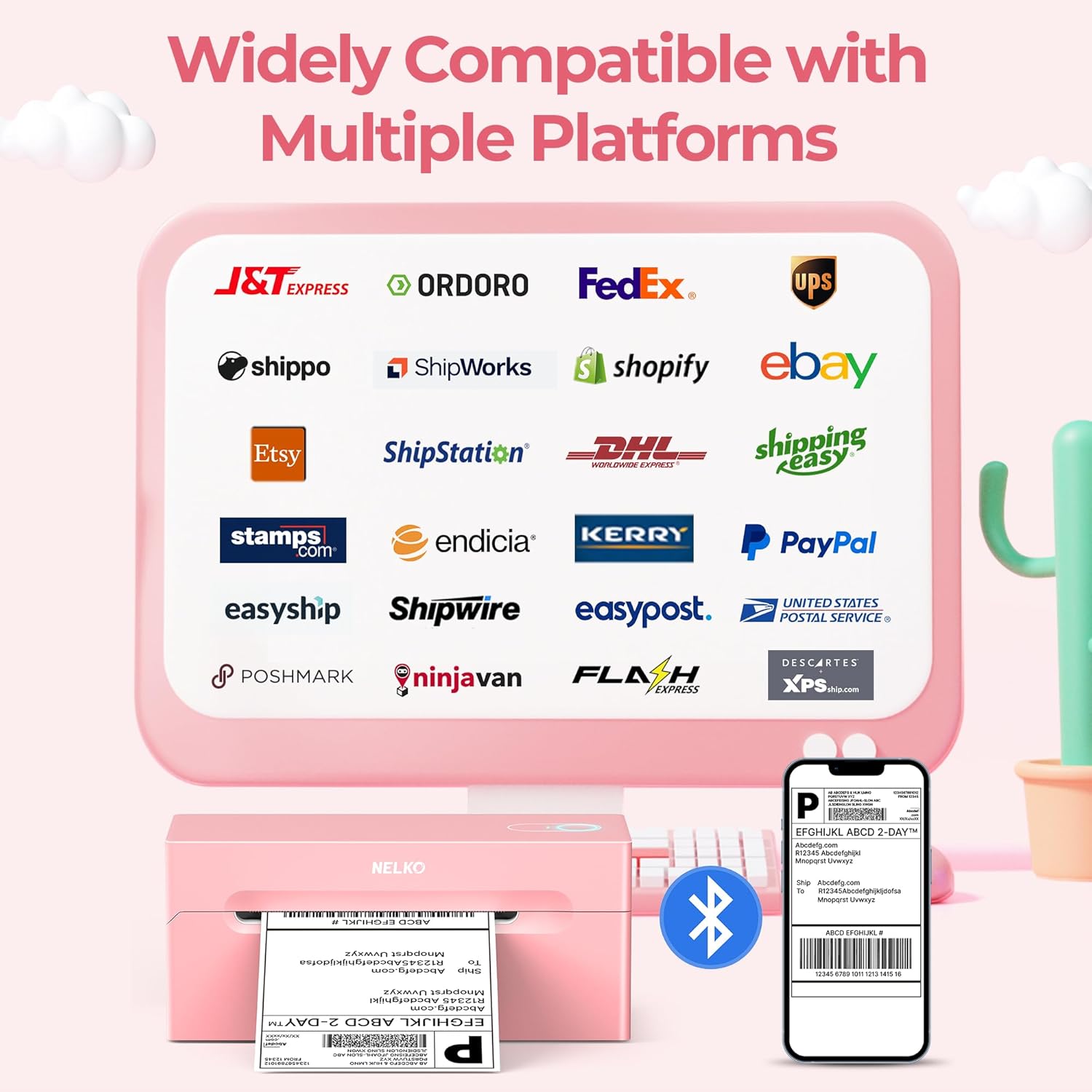 Nelko Bluetooth Thermal Shipping Label Printer, Wireless 4x6 Shipping Label Printer for Small Business, Support Android, iPhone and Windows, Widely Used for Amazon, Ebay, Shopify, USPS(Pink)