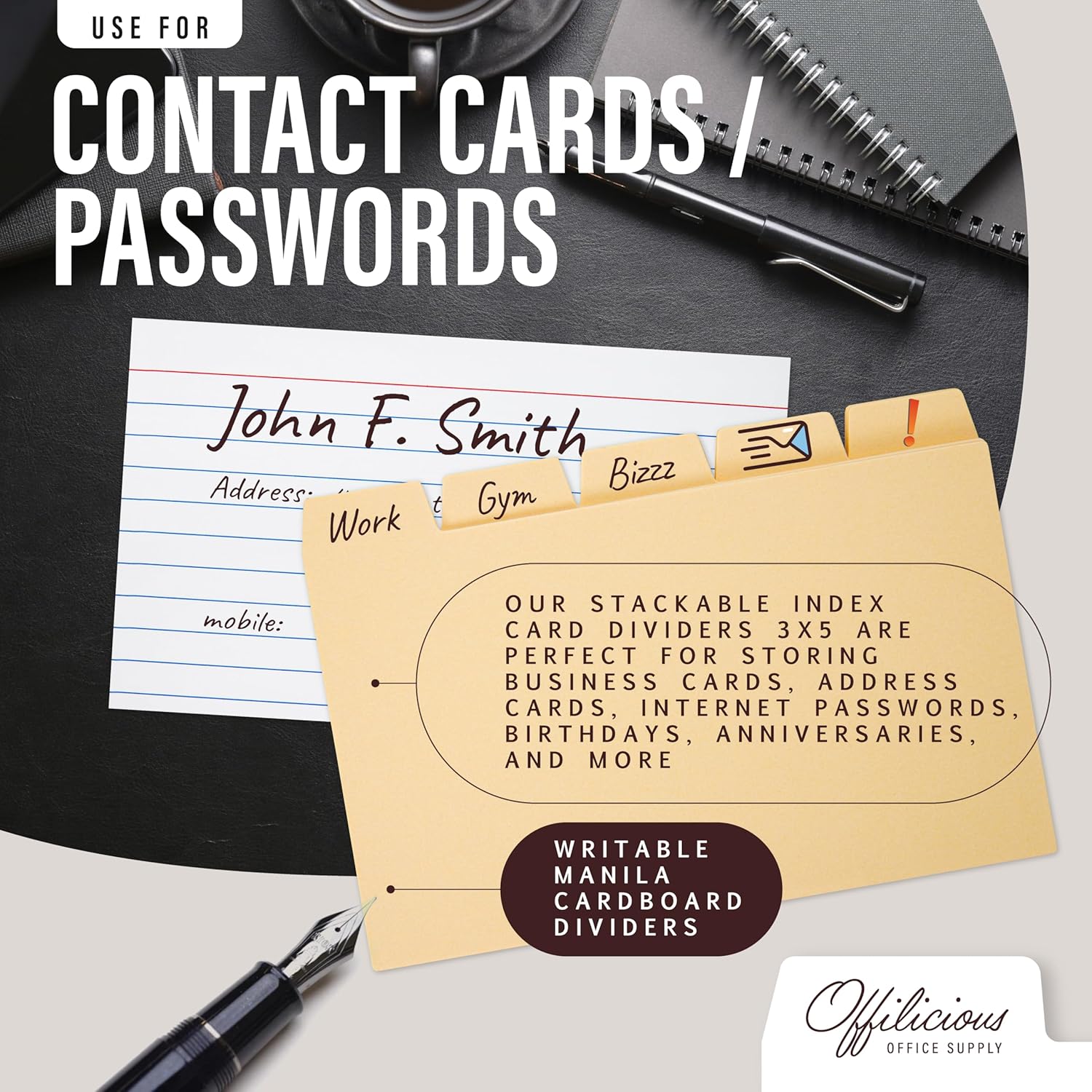 - AT OFFILICIOUS, WE’RE COMMITTED to providing the most QUALITY-CRAFTED index month folder accessories. Our index card tab dividers are made with THE BEST MATERIALS for TASTEFULLY DESIGNED, index file box storage you’ll love for YOUR OFFICE & HOME. If for any reason you aren’t satisfied with your alphabet dividers for index cards, we’re standing by to help.