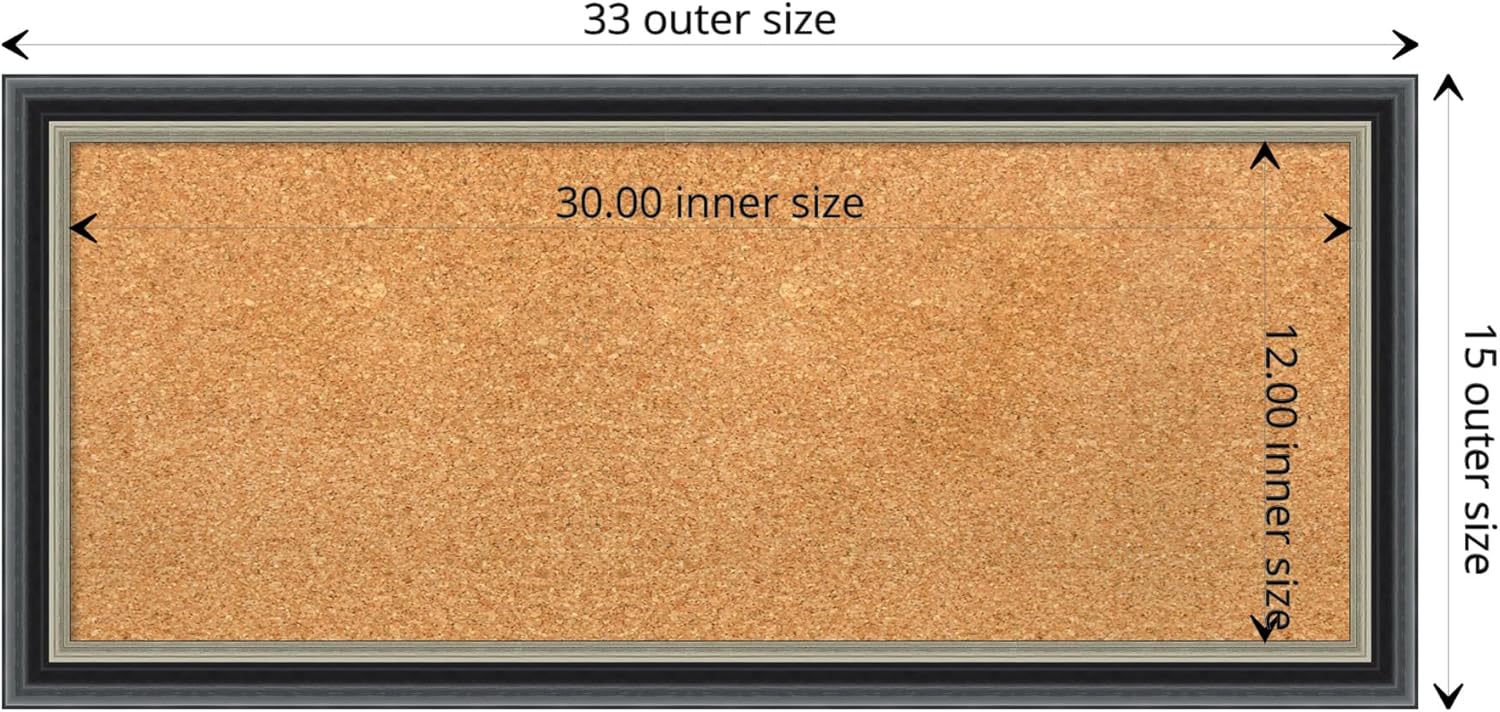 - DIMENSIONS: The overall size of this framed corkboard measures 33 in. x 15 in., including the frame. Its functional cork board area measures 30 in. x 12 in.