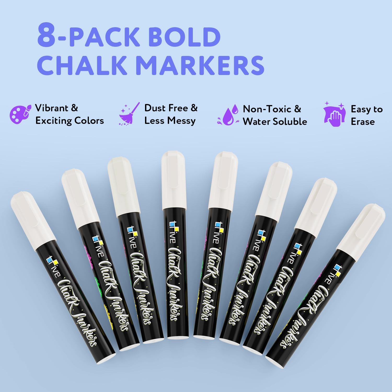 TFIVE White Chalk Markers - Dry & Wet Erase Marker Pens for Chalkboards, Signs, Windows, Blackboard, Glass, Mirrors, Liquid chalkboard markers with Reversible Tip and 24 Labels(8 Pack)