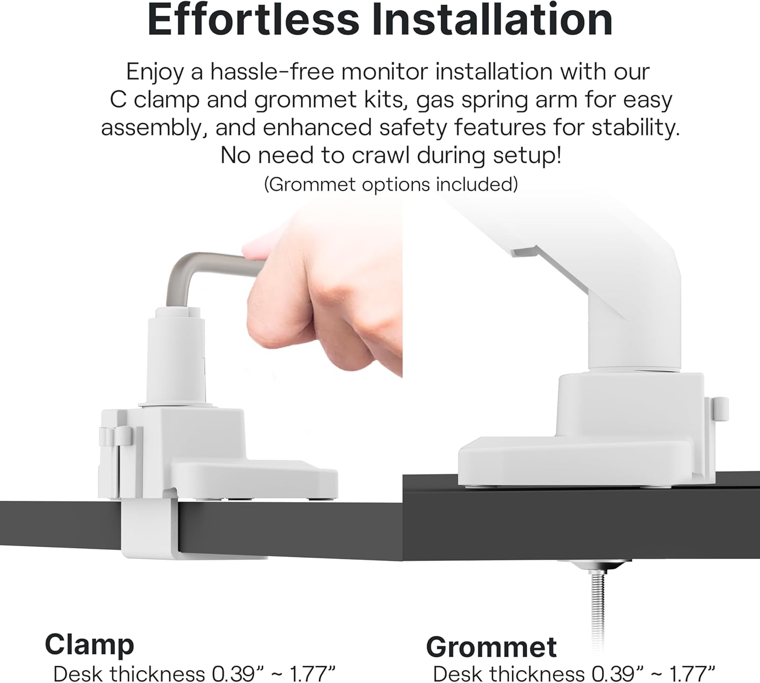 - Easy Installation: Comes with both C clamp (default) and grommet kits. Instead of having to access the bottom of the desk to secure the arm, the arm is instead installed from the top of the base, allowing fora more convenient way to install the arm.The enlarged base and strong clamp ensure safety and stability for your computer screen, and the clamp fits tables 0.39 inches to 2 inches in thickness. The grommet installation fits up to 1.7 inches.