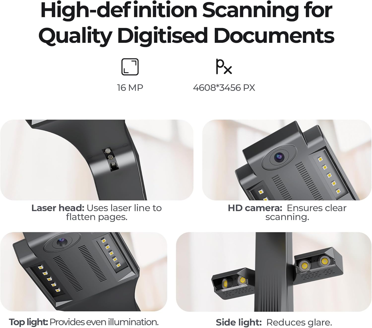 - 16MP HD Camera, Easy and Fast: Embedded 16MP HD Camera and with the 1.5 S/P scanning speed, ET16 Plus can easily finish scanning a 300 page book within 10 min, which is 10 times faster than traditional scanner