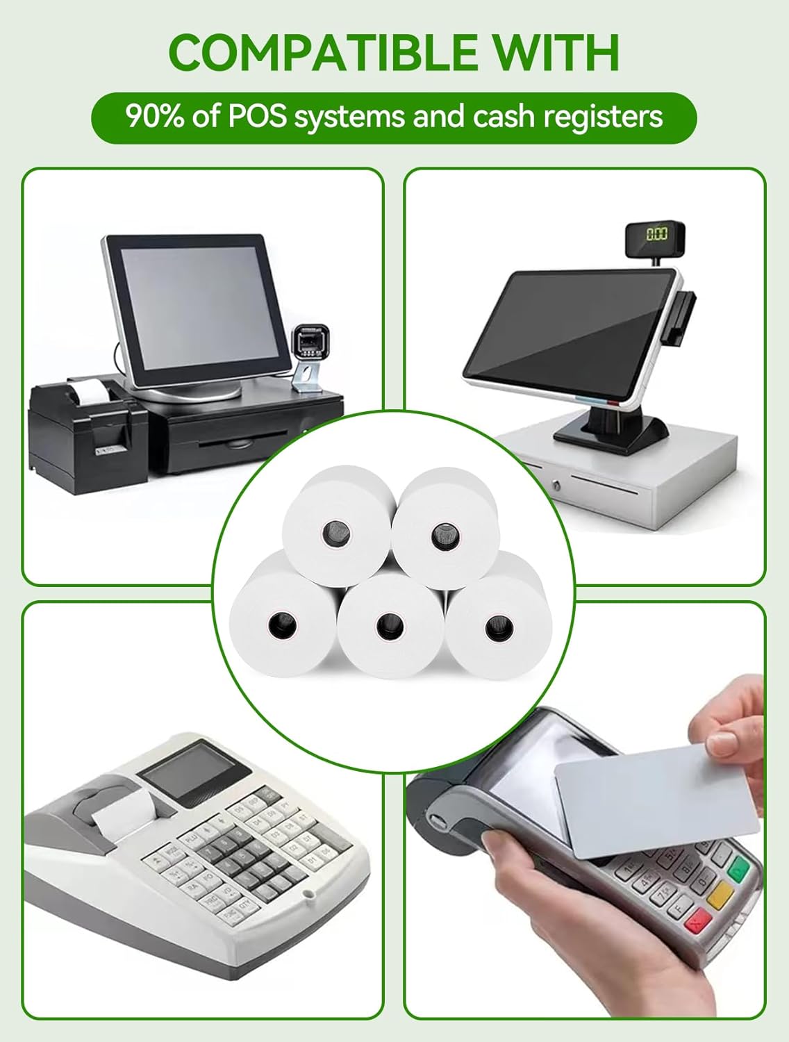 - Compatible with All POS Cash Registers, Credit Card Terminals, and Receipt Printers: Our thermal paper rolls are engineered for universal compatibility. Whether you're using POS cash registers, credit card terminals, or receipt printers from various brands and models, rest assured that our rolls seamlessly integrate with your equipment. This compatibility ensures hassle-free printing, minimizing downtime and optimizing workflow efficiency.